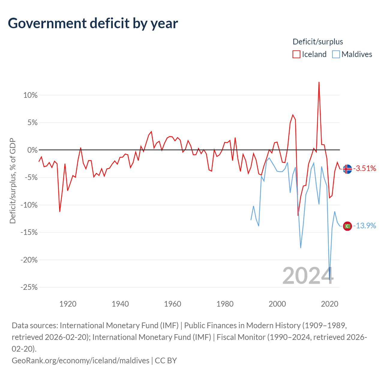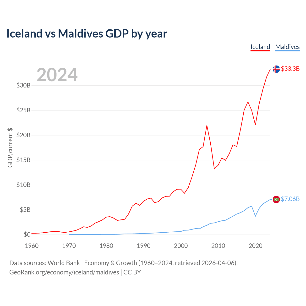 Iceland has a GDP of $33.3B compared to $7.06B for Maldives, ranking 108/197 and 159/197 by economy size, respectively.