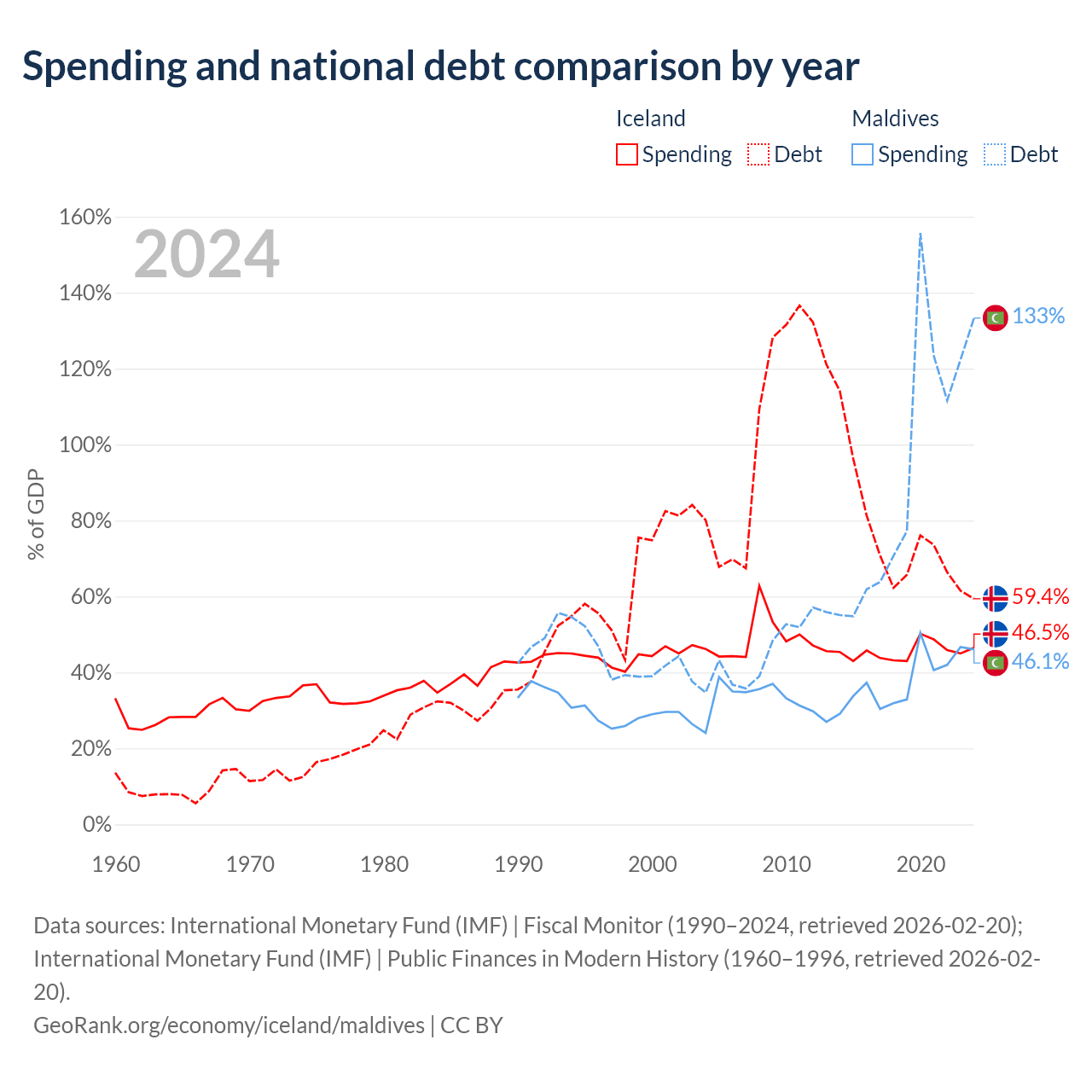 Iceland has $19.8B in government debt (59.4% of GDP), compared to $9.41B (133.3% of GDP) in Maldives.