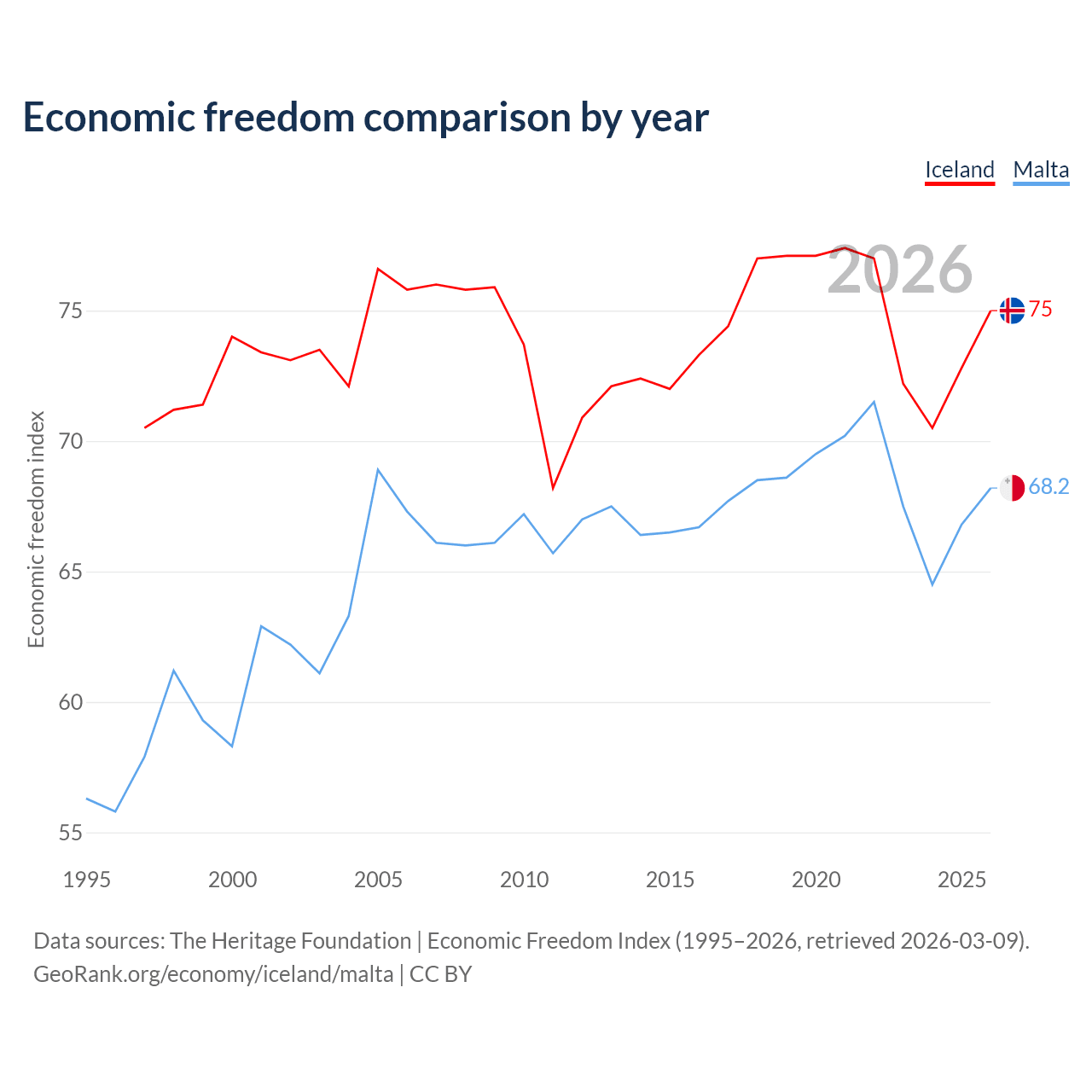 The Economic Freedom Index for Iceland is 75, ranking 19/197, compared to 68.2 for Malta, ranking 49/197. The chart above displays a comparison of annual changes in economic freedom indexes.