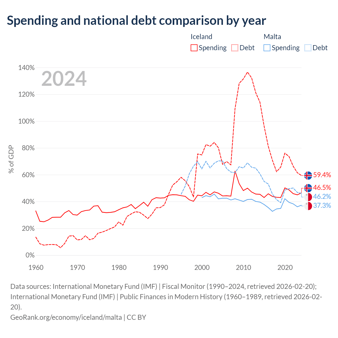 Iceland has $19.8B in government debt (59.4% of GDP), compared to $11.5B (46.2% of GDP) in Malta.