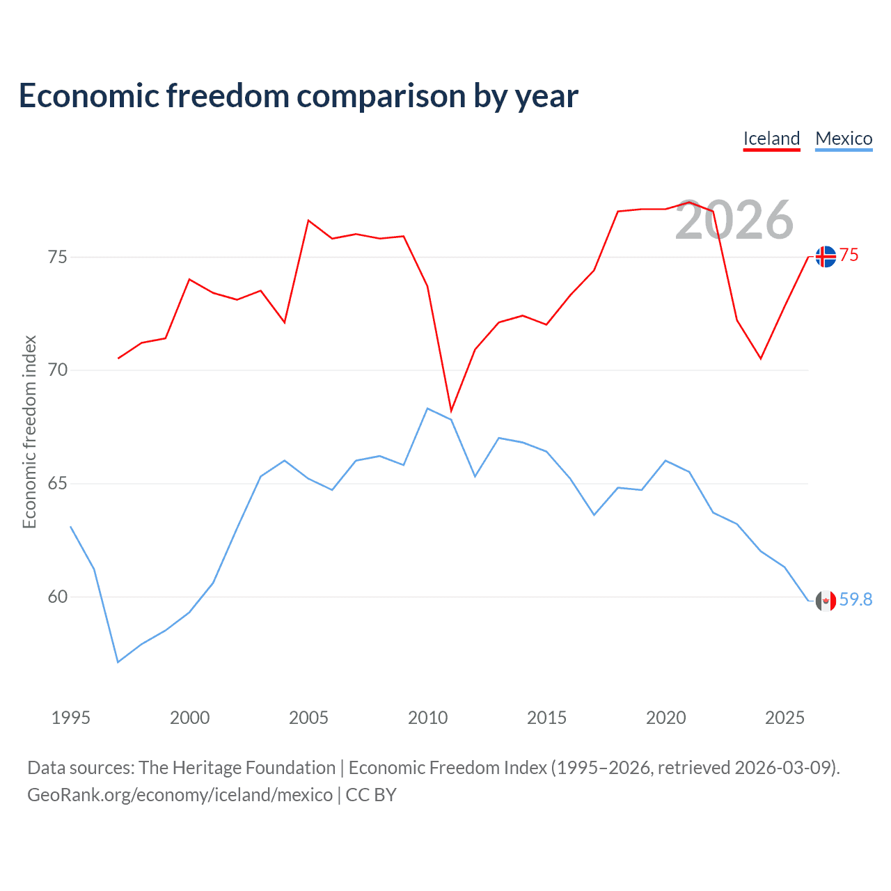 The Economic Freedom Index for Iceland is 75, ranking 19/197, compared to 59.8 for Mexico, ranking 102/197. The chart above displays a comparison of annual changes in economic freedom indexes.