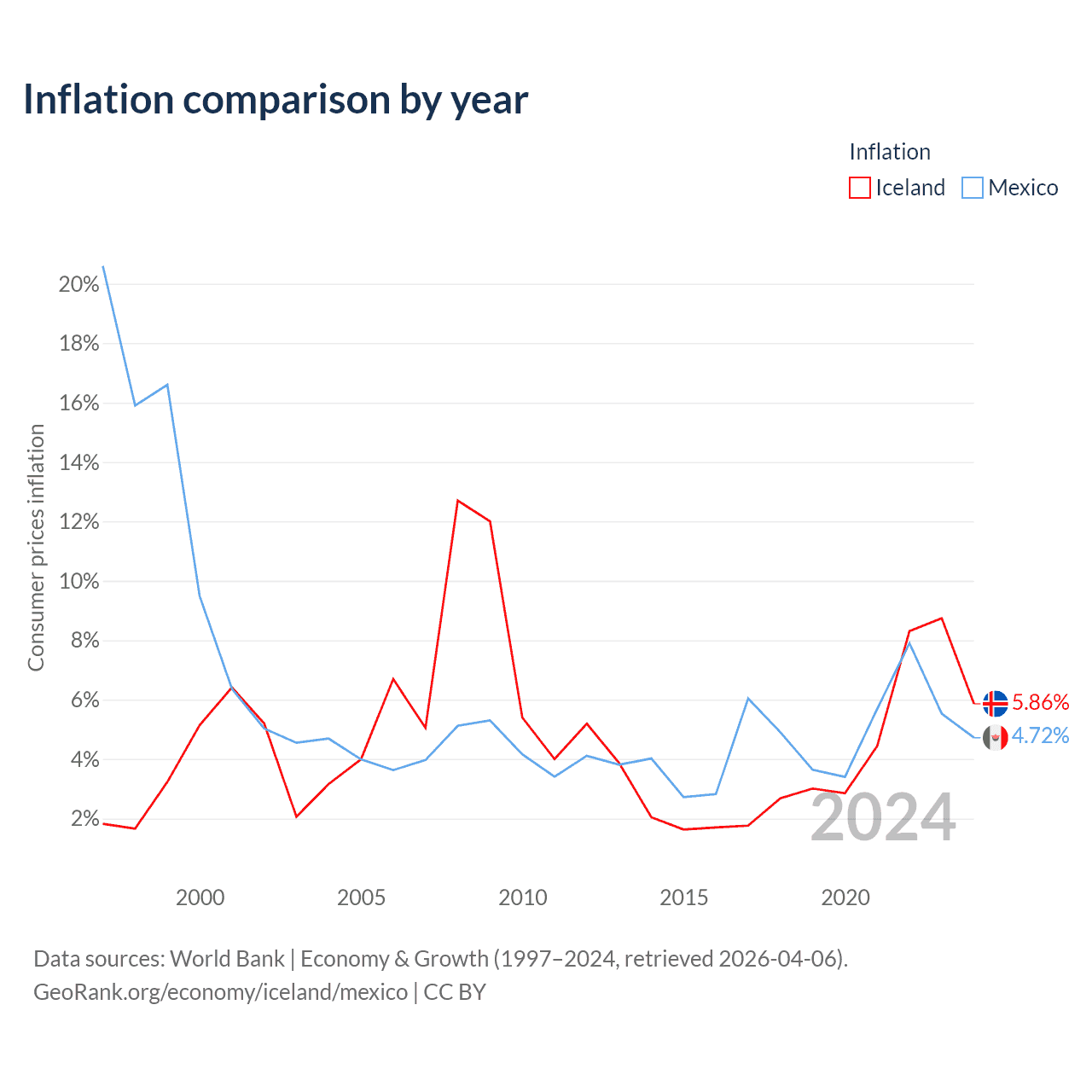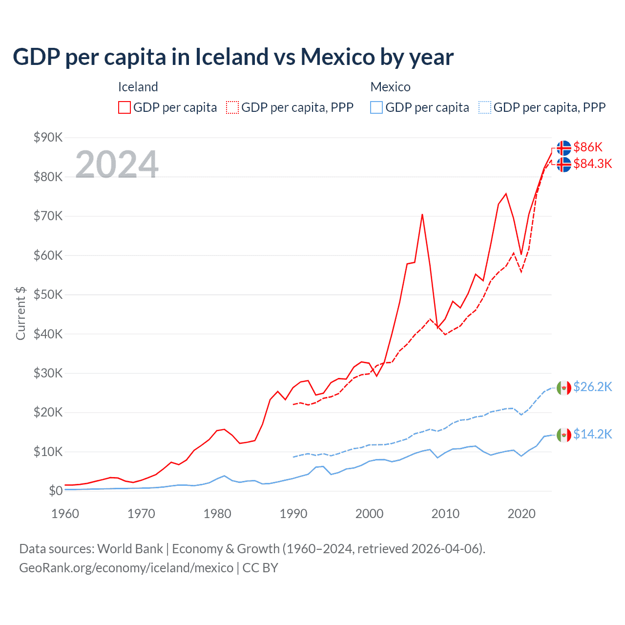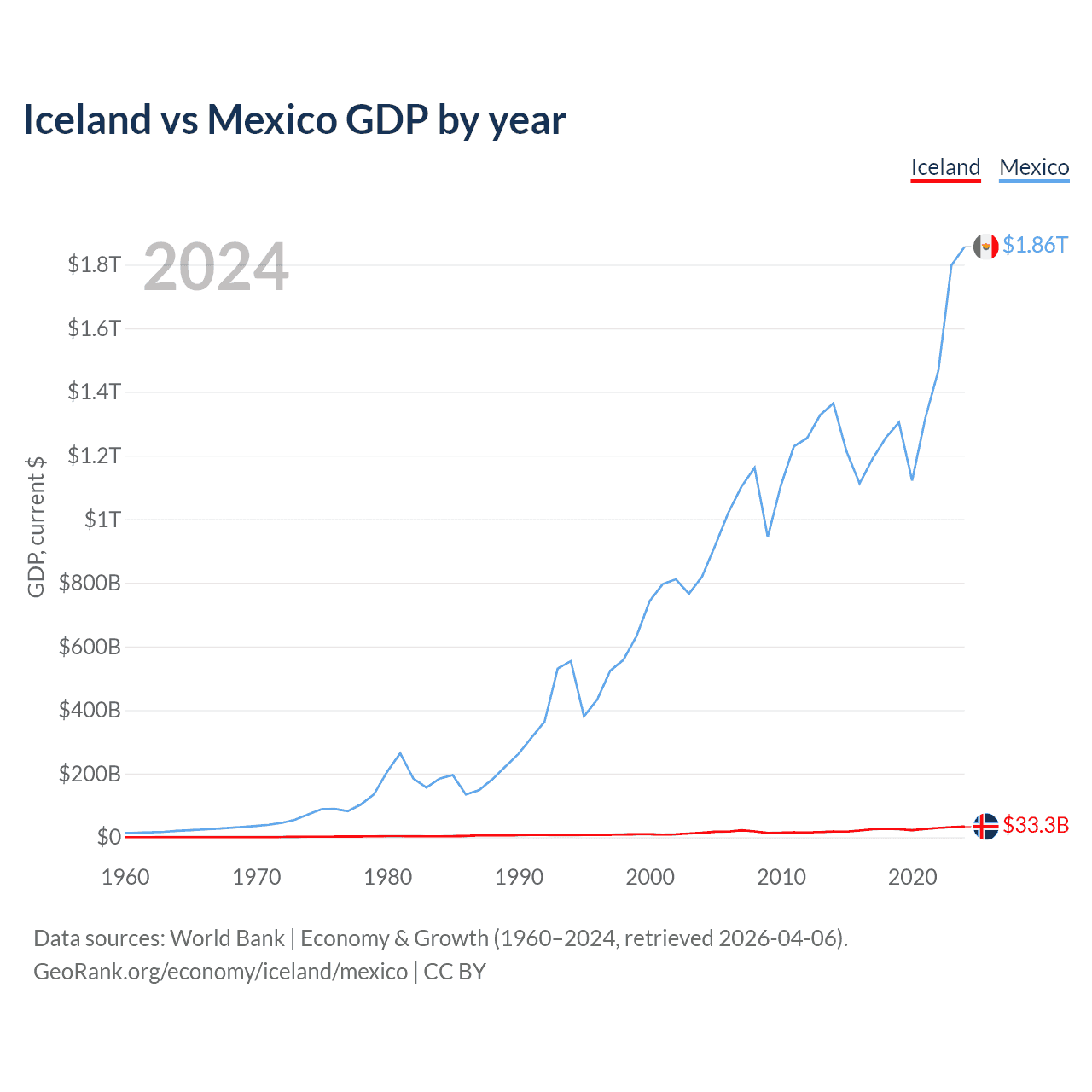 Iceland has a GDP of $33.3B compared to $1.86T for Mexico, ranking 108/197 and 13/197 by economy size, respectively.