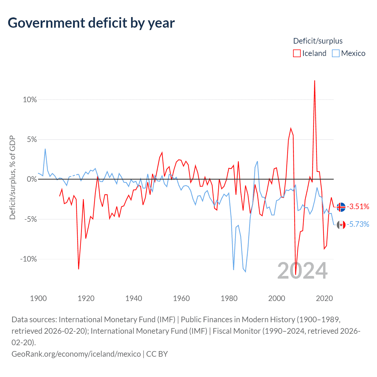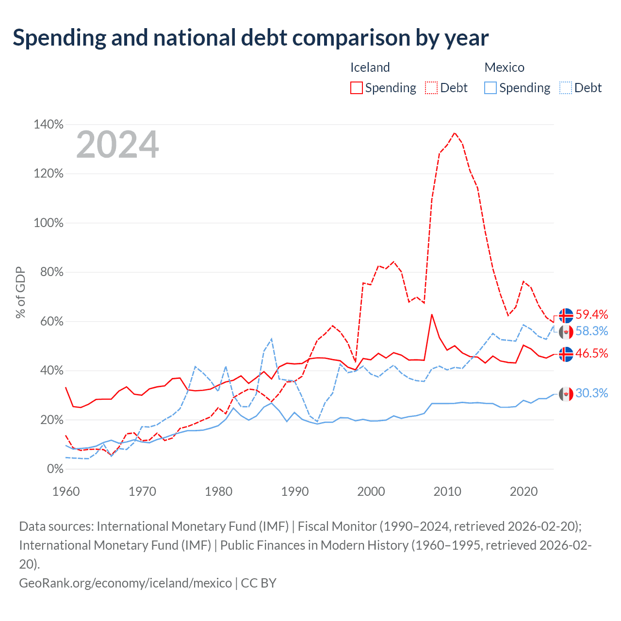 Iceland has $19.8B in government debt (59.4% of GDP), compared to $1.08T (58.3% of GDP) in Mexico.