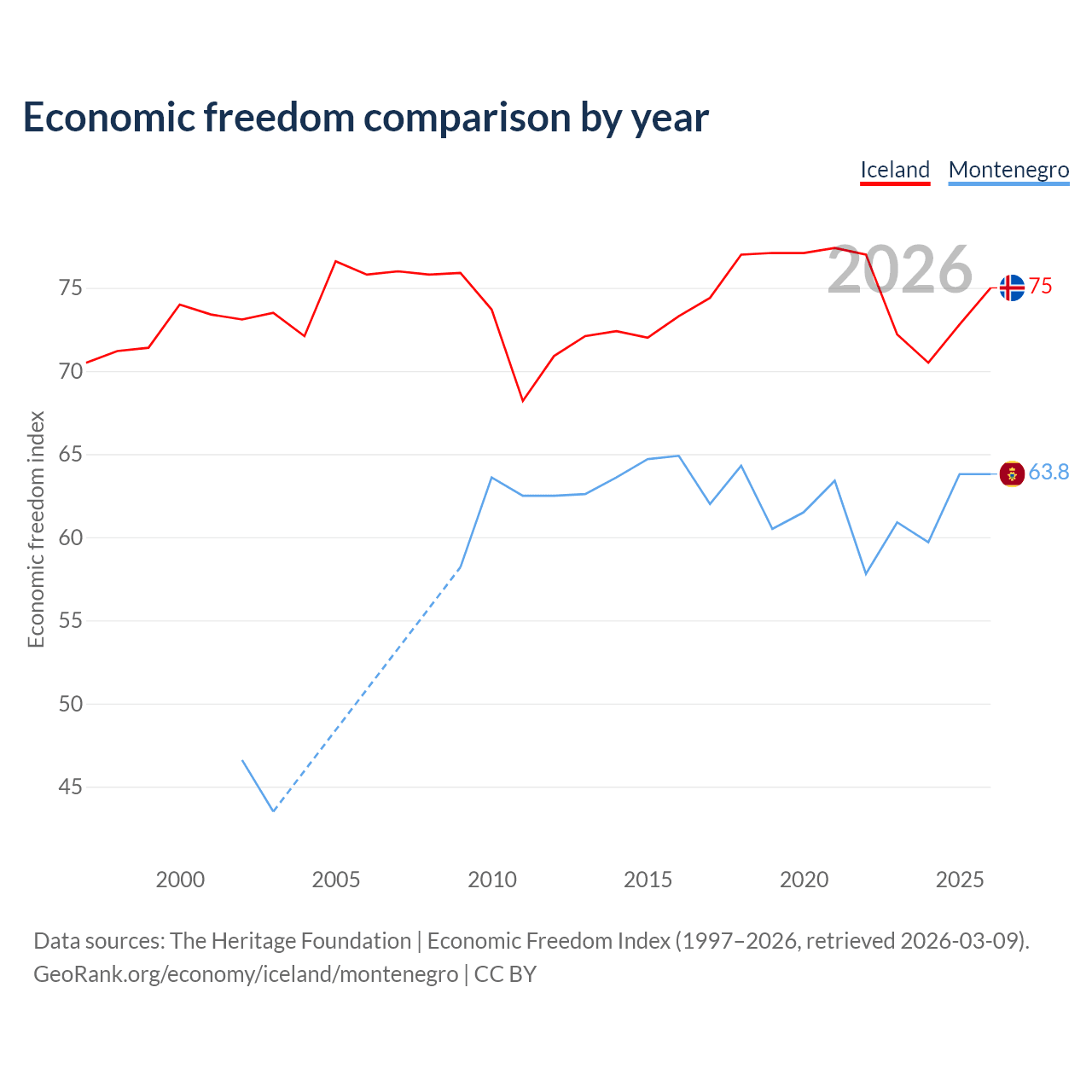 The Economic Freedom Index for Iceland is 75, ranking 19/197, compared to 63.8 for Montenegro, ranking 78/197. The chart above displays a comparison of annual changes in economic freedom indexes.
