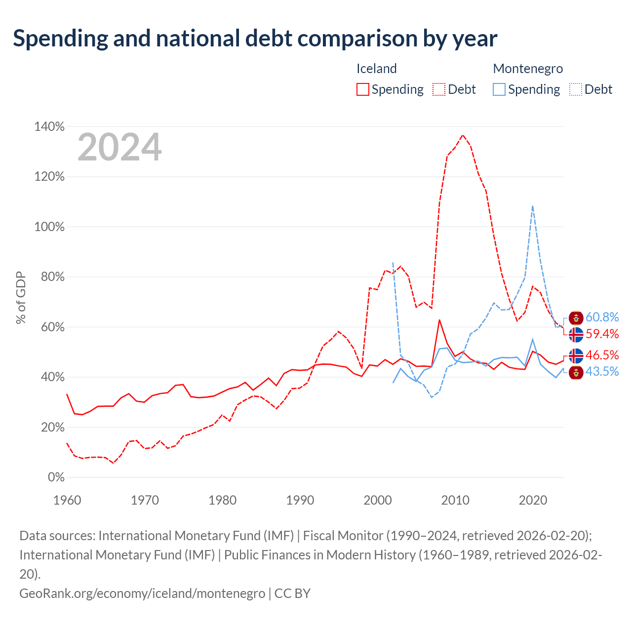 Iceland has $19.8B in government debt (59.4% of GDP), compared to $5.02B (60.8% of GDP) in Montenegro.