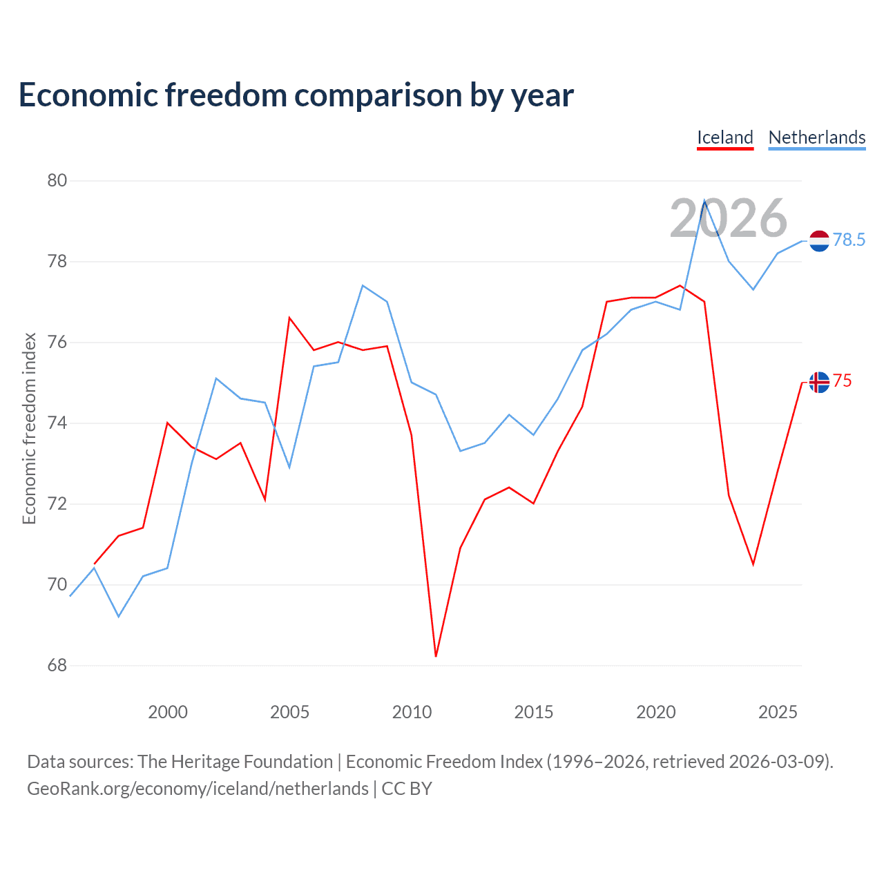 The Economic Freedom Index for Iceland is 75, ranking 19/197, compared to 78.5 for the Netherlands, ranking 11/197. The chart above displays a comparison of annual changes in economic freedom indexes.