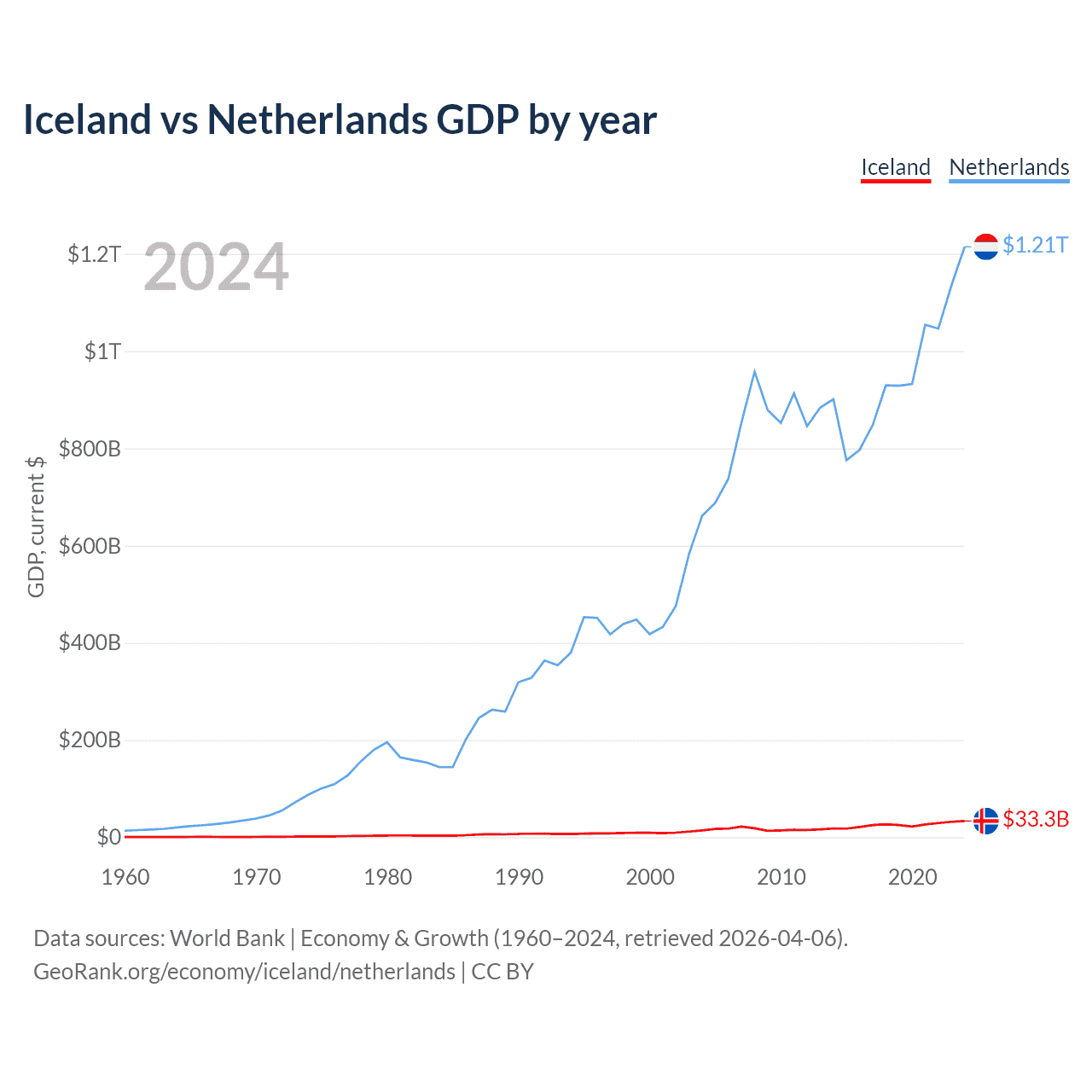 Iceland has a GDP of $33.3B compared to $1.21T for the Netherlands, ranking 108/197 and 19/197 by economy size, respectively.