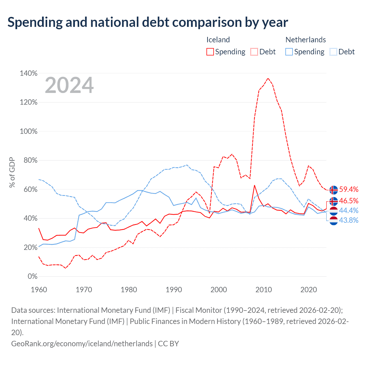 Iceland has $19.8B in government debt (59.4% of GDP), compared to $532B (43.8% of GDP) in the Netherlands.