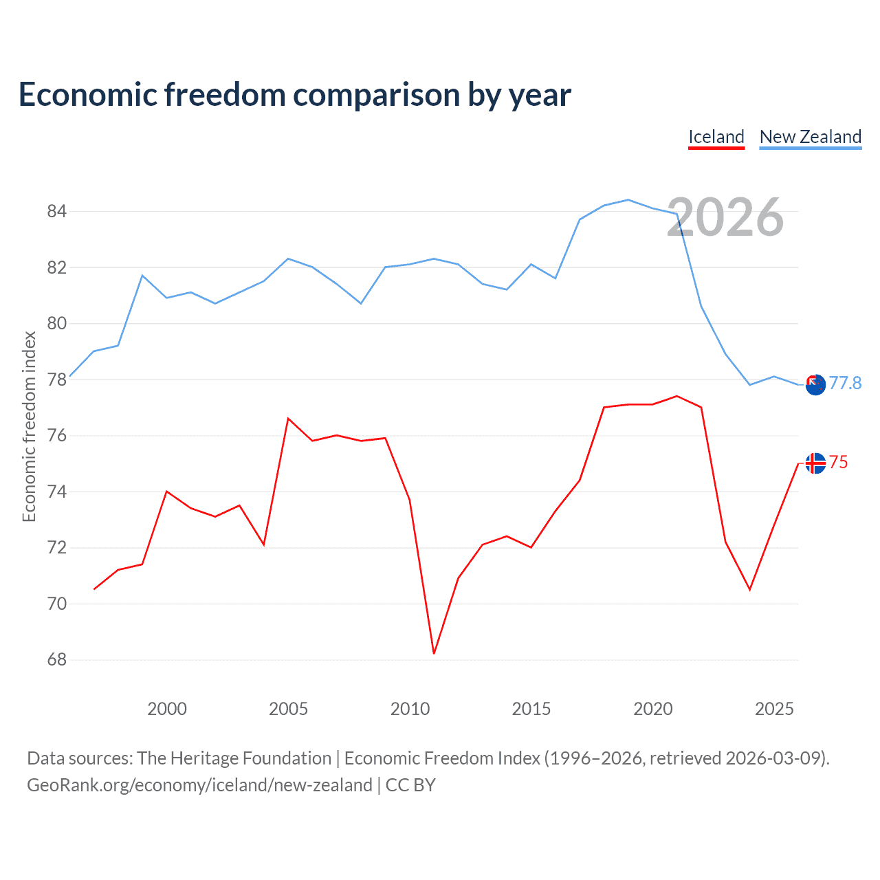 The Economic Freedom Index for Iceland is 75, ranking 19/197, compared to 77.8 for New Zealand, ranking 13/197. The chart above displays a comparison of annual changes in economic freedom indexes.