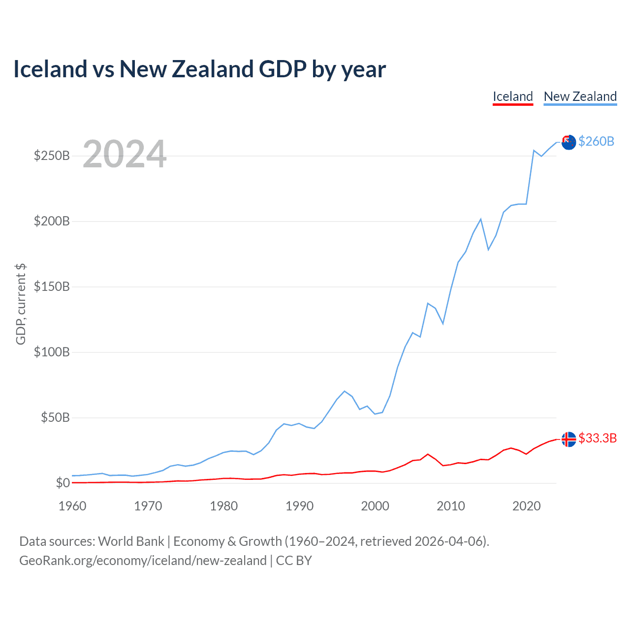 Iceland has a GDP of $33.3B compared to $260B for New Zealand, ranking 108/197 and 52/197 by economy size, respectively.
