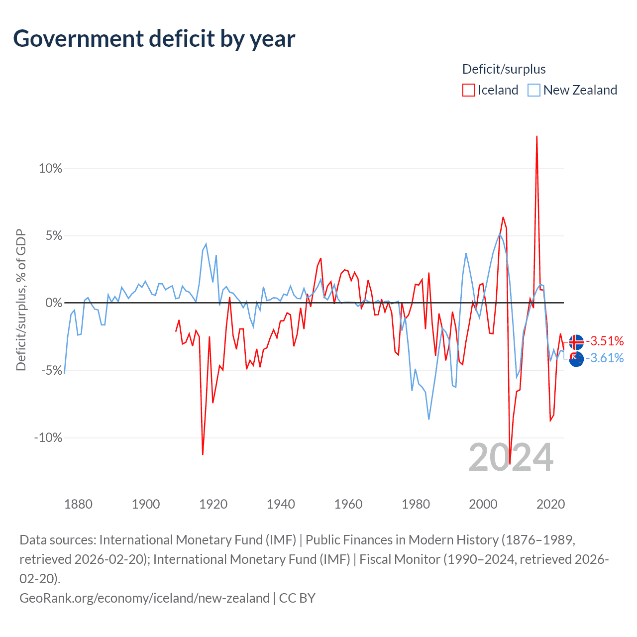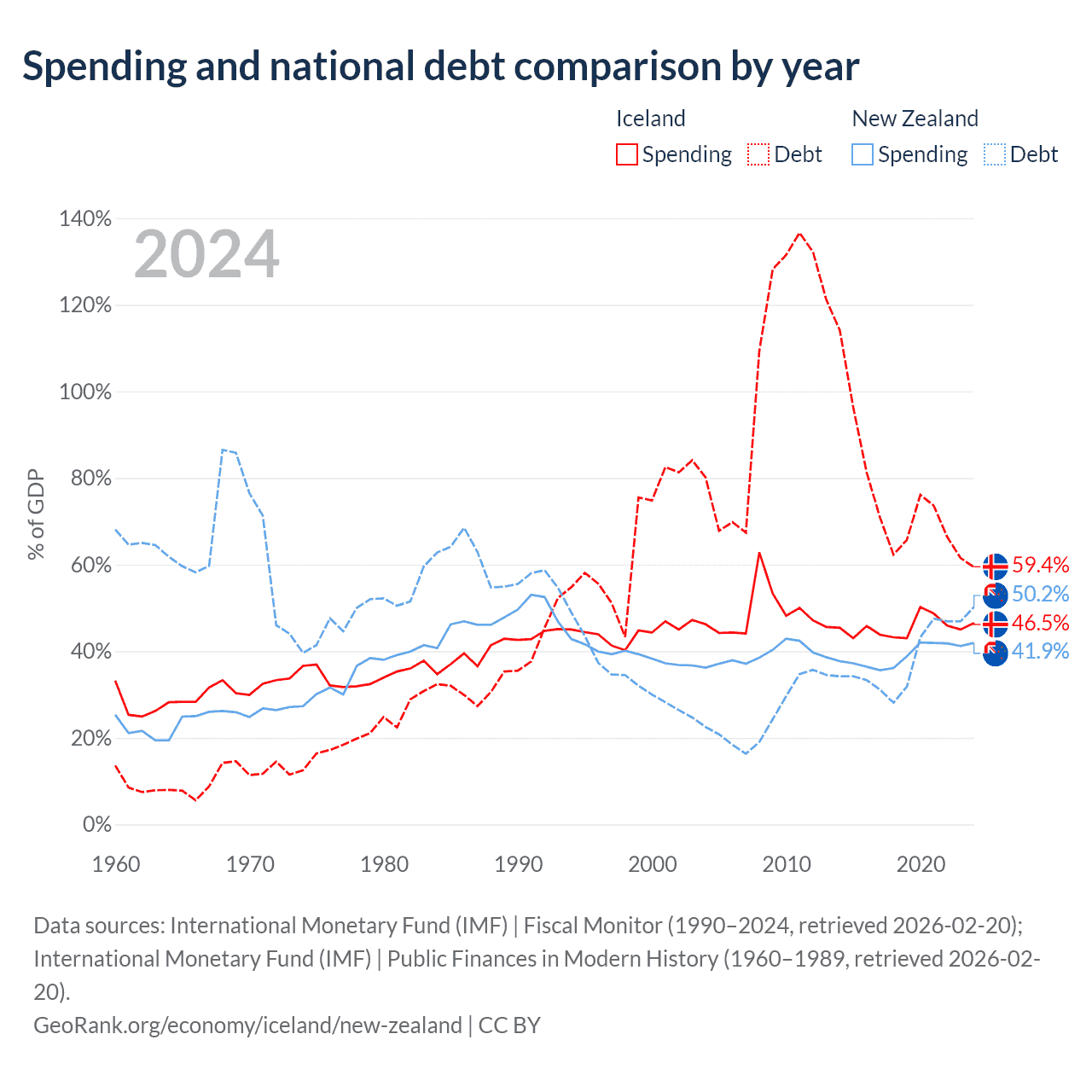 Iceland has $19.8B in government debt (59.4% of GDP), compared to $131B (50.2% of GDP) in New Zealand.