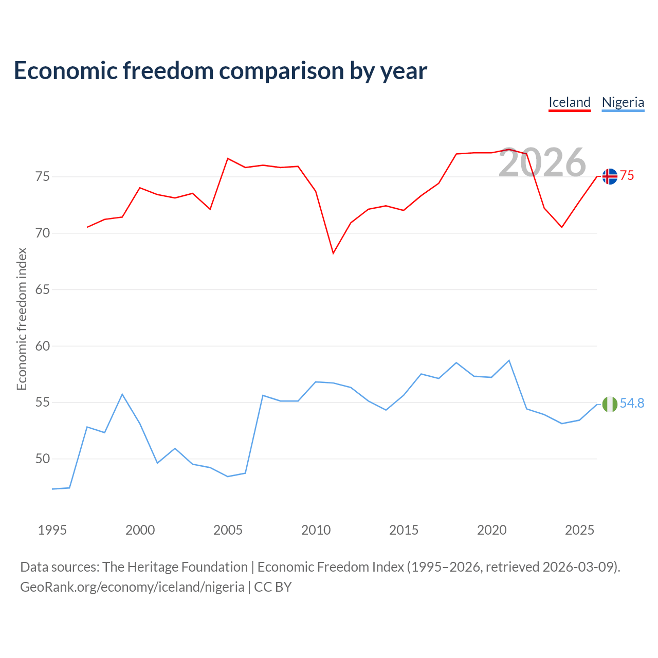 The Economic Freedom Index for Iceland is 75, ranking 19/197, compared to 54.8 for Nigeria, ranking 132/197. The chart above displays a comparison of annual changes in economic freedom indexes.