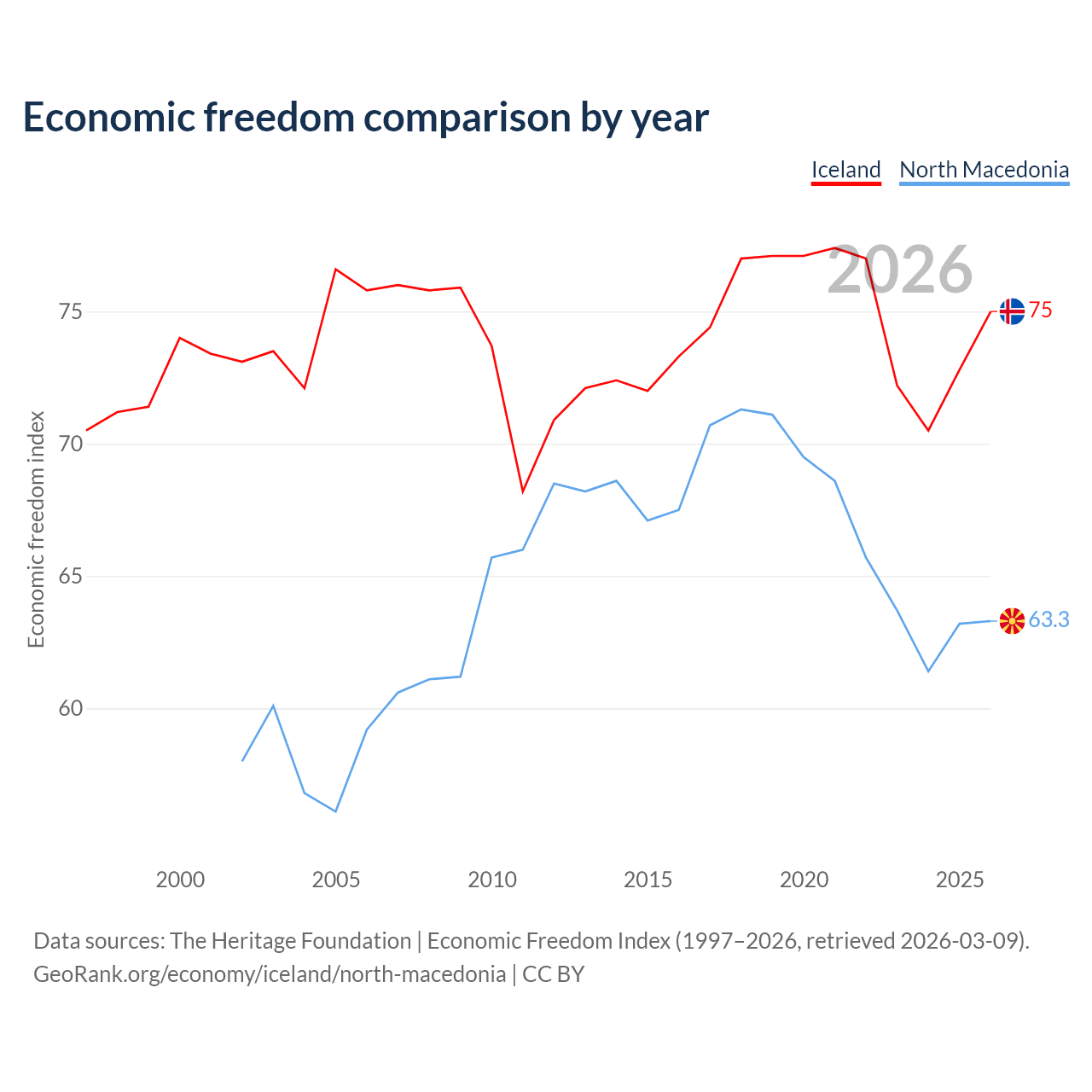 The Economic Freedom Index for Iceland is 75, ranking 19/197, compared to 63.3 for North Macedonia, ranking 81/197. The chart above displays a comparison of annual changes in economic freedom indexes.