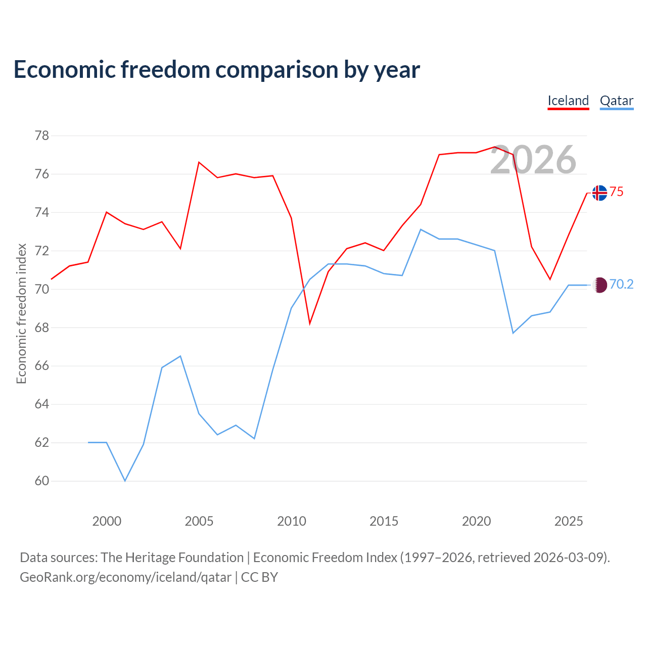 The Economic Freedom Index for Iceland is 75, ranking 19/197, compared to 70.2 for Qatar, ranking 37/197. The chart above displays a comparison of annual changes in economic freedom indexes.