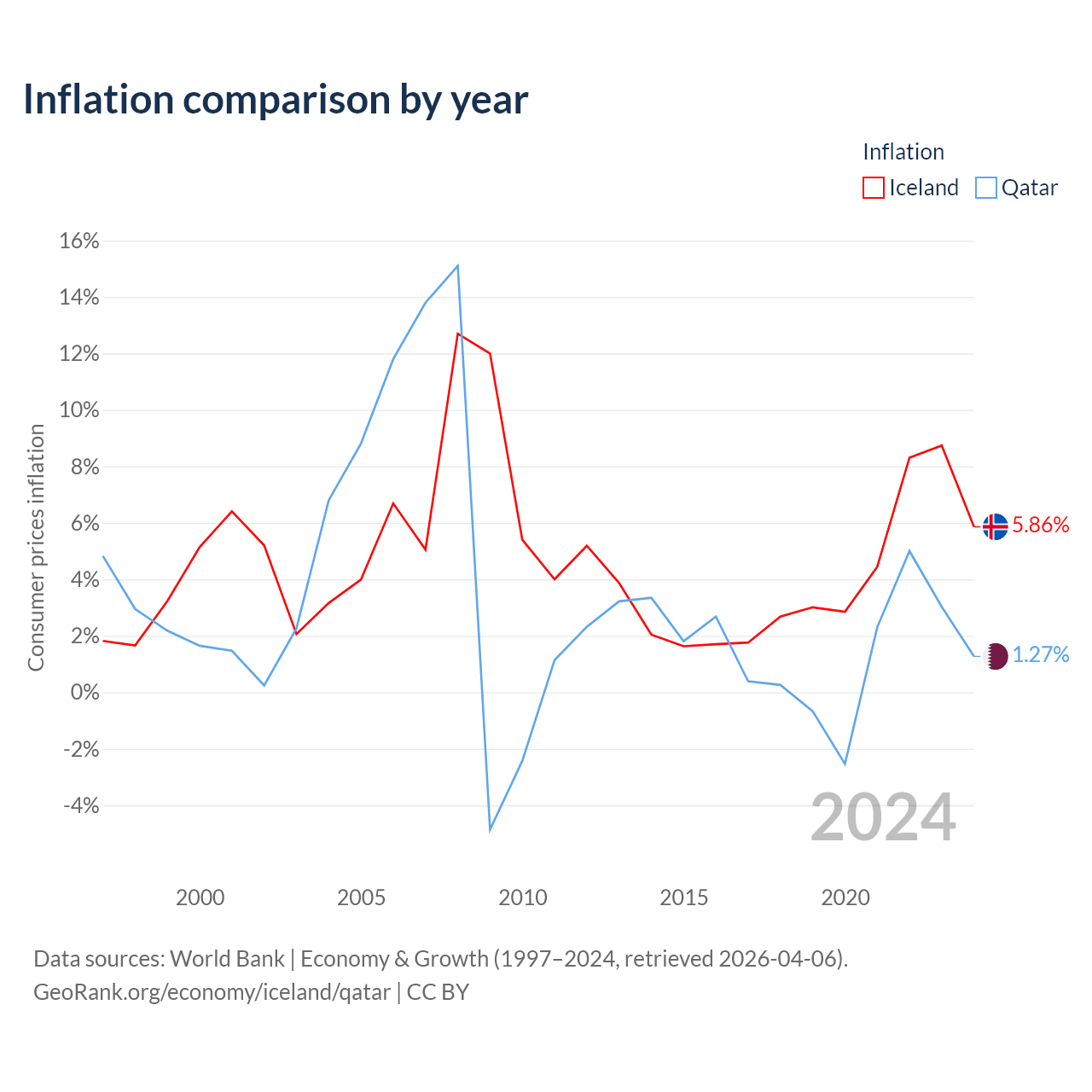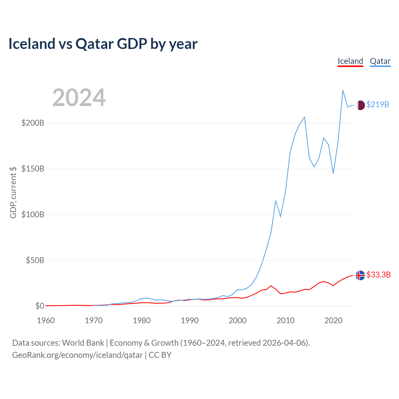 Iceland has a GDP of $33.3B compared to $219B for Qatar, ranking 108/197 and 56/197 by economy size, respectively.