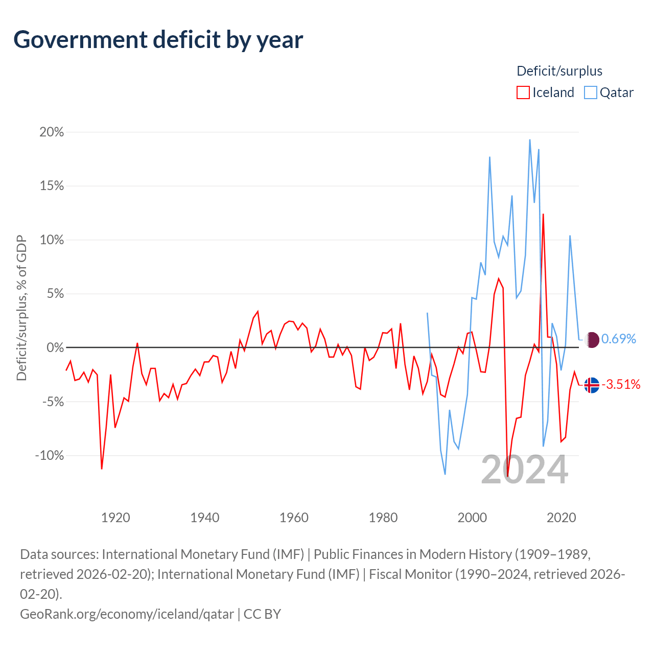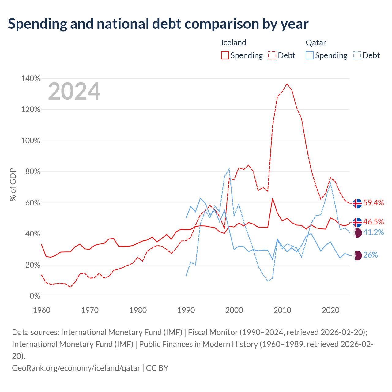 Iceland has $19.8B in government debt (59.4% of GDP), compared to $90.2B (41.2% of GDP) in Qatar.