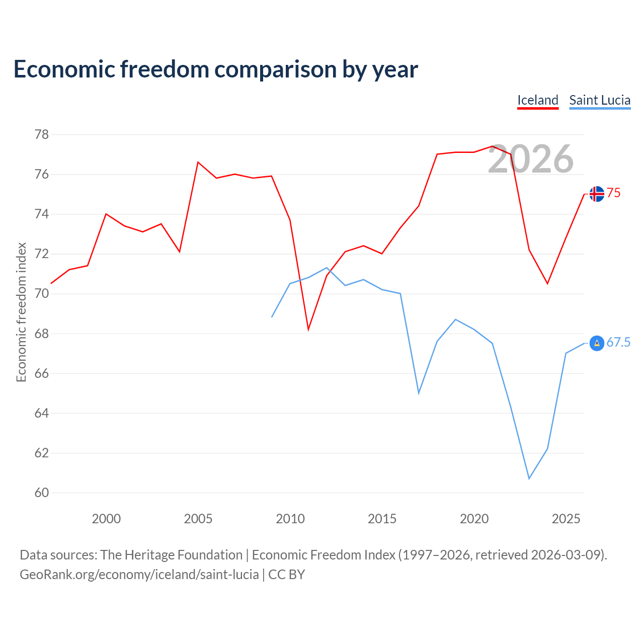 The Economic Freedom Index for Iceland is 75, ranking 19/197, compared to 67.5 for Saint Lucia, ranking 57/197. The chart above displays a comparison of annual changes in economic freedom indexes.