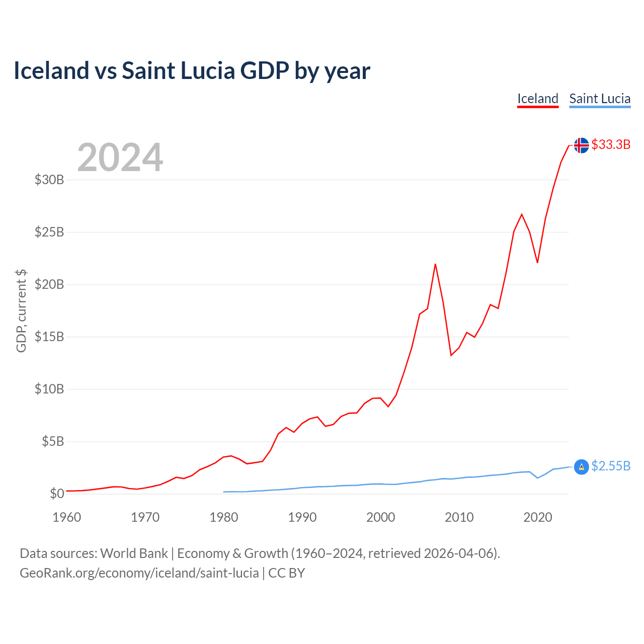 Iceland has a GDP of $33.3B compared to $2.55B for Saint Lucia, ranking 108/197 and 173/197 by economy size, respectively.