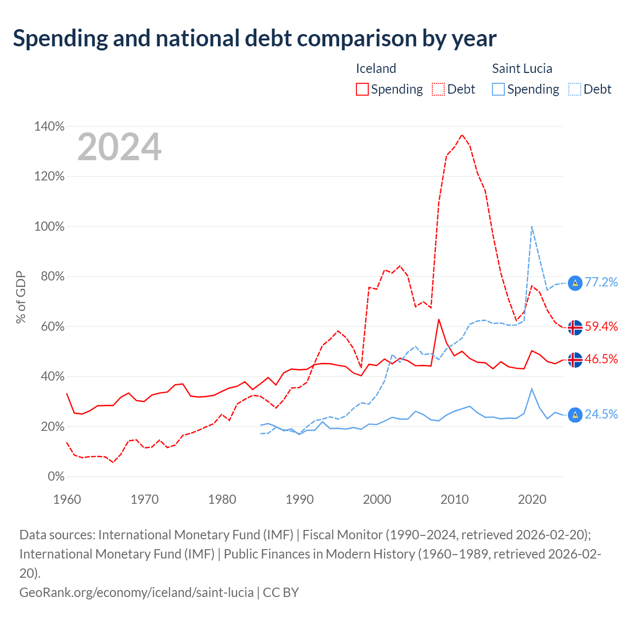 Iceland has $19.8B in government debt (59.4% of GDP), compared to $1.97B (77.2% of GDP) in Saint Lucia.