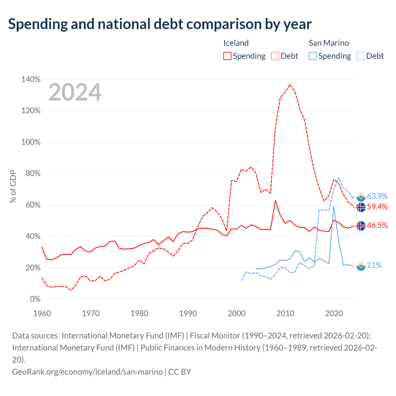Iceland has $19.8B in government debt (59.4% of GDP), compared to $1.39B (63.9% of GDP) in San Marino.