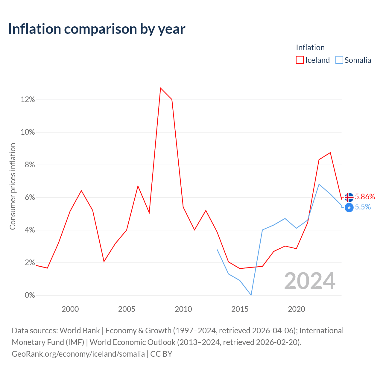 Over the past 12 years, Iceland has recorded an average annual inflation rate of 3.91%, compared with 3.77% in Somalia. In 2024, inflation was 5.86% in Iceland and 5.5% in Somalia.