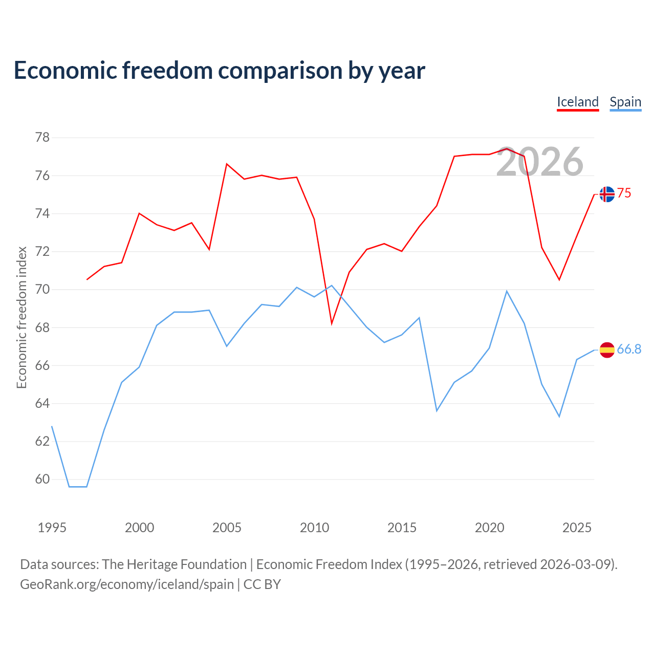 The Economic Freedom Index for Iceland is 75, ranking 19/197, compared to 66.8 for Spain, ranking 59/197. The chart above displays a comparison of annual changes in economic freedom indexes.