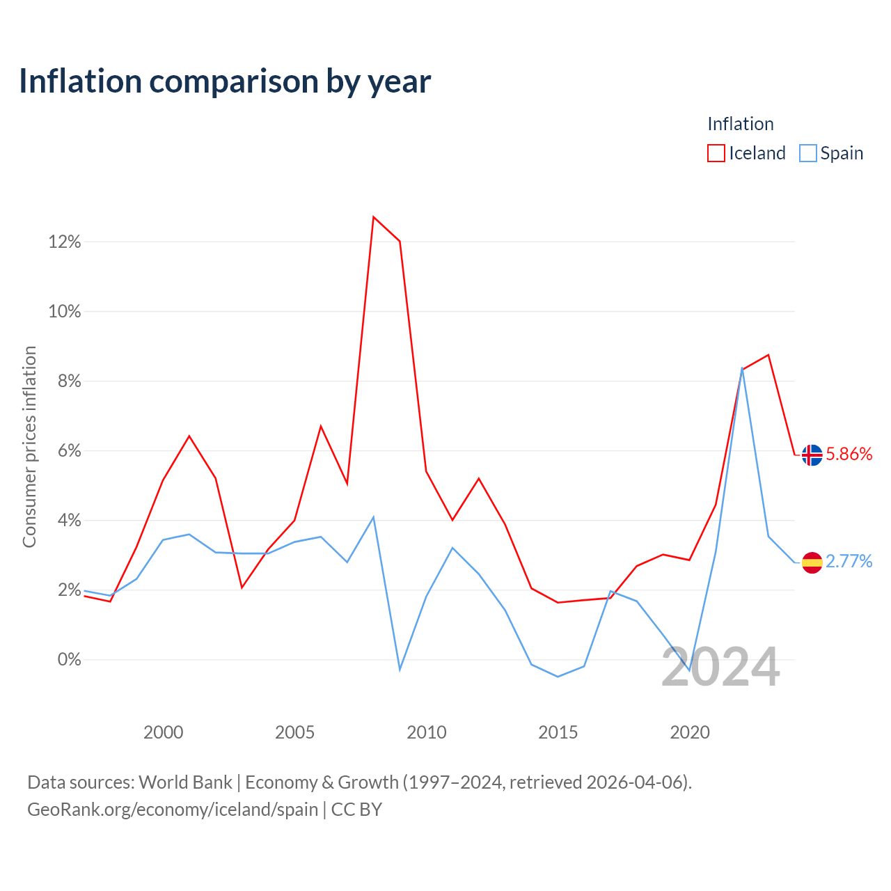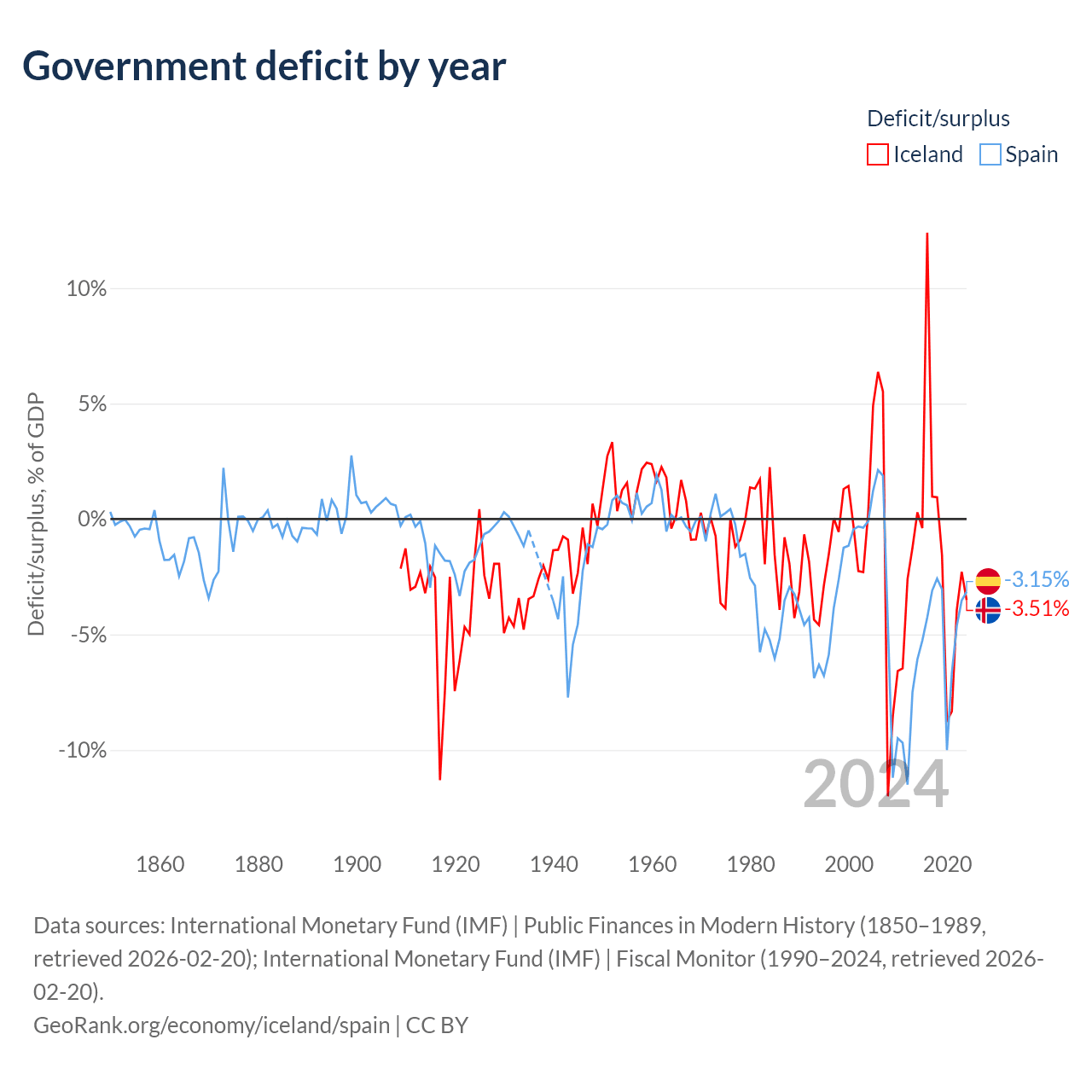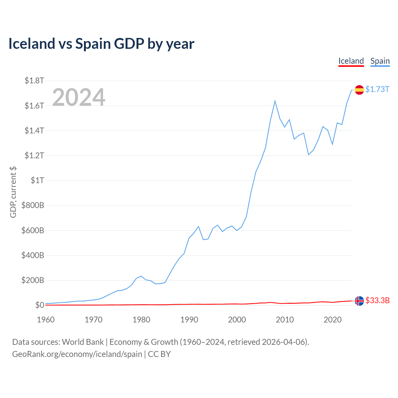Iceland has a GDP of $33.3B compared to $1.73T for Spain, ranking 108/197 and 15/197 by economy size, respectively.
