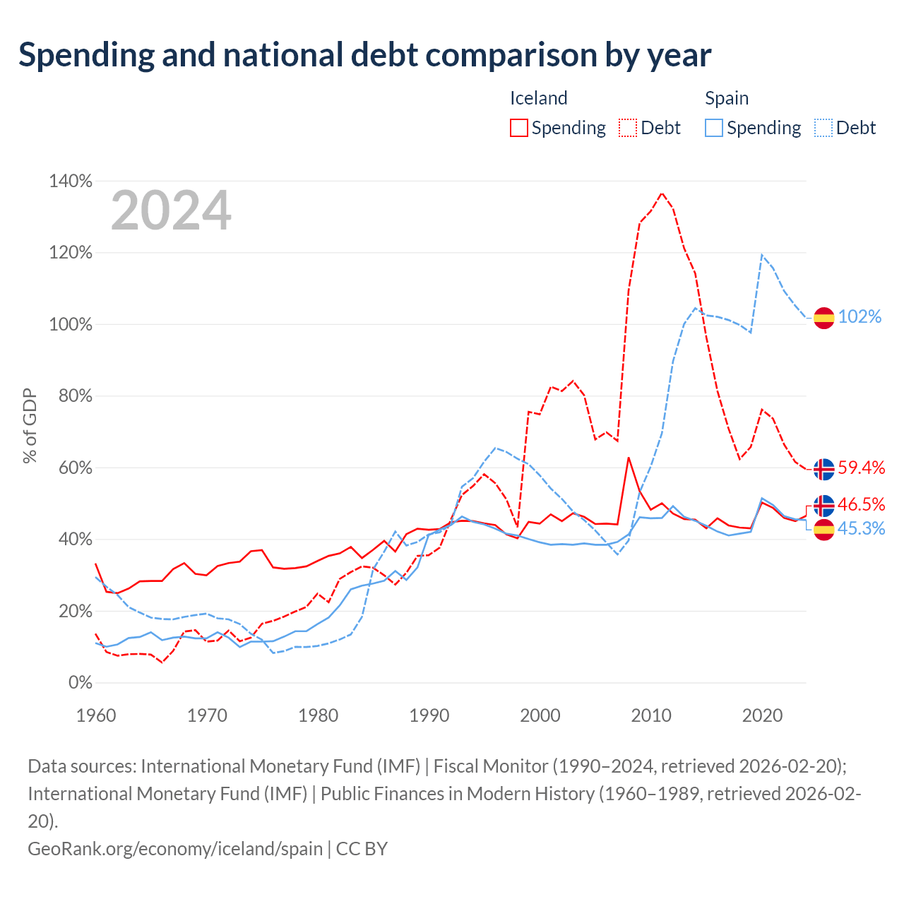 Iceland has $19.8B in government debt (59.4% of GDP), compared to $1.75T (101.6% of GDP) in Spain.