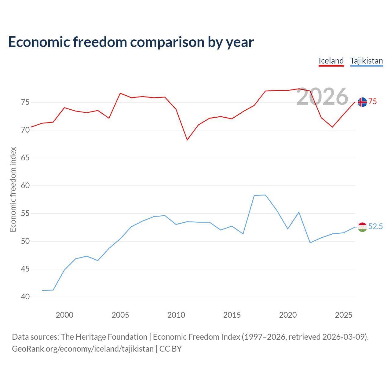 The Economic Freedom Index for Iceland is 75, ranking 19/197, compared to 52.5 for Tajikistan, ranking 147/197. The chart above displays a comparison of annual changes in economic freedom indexes.