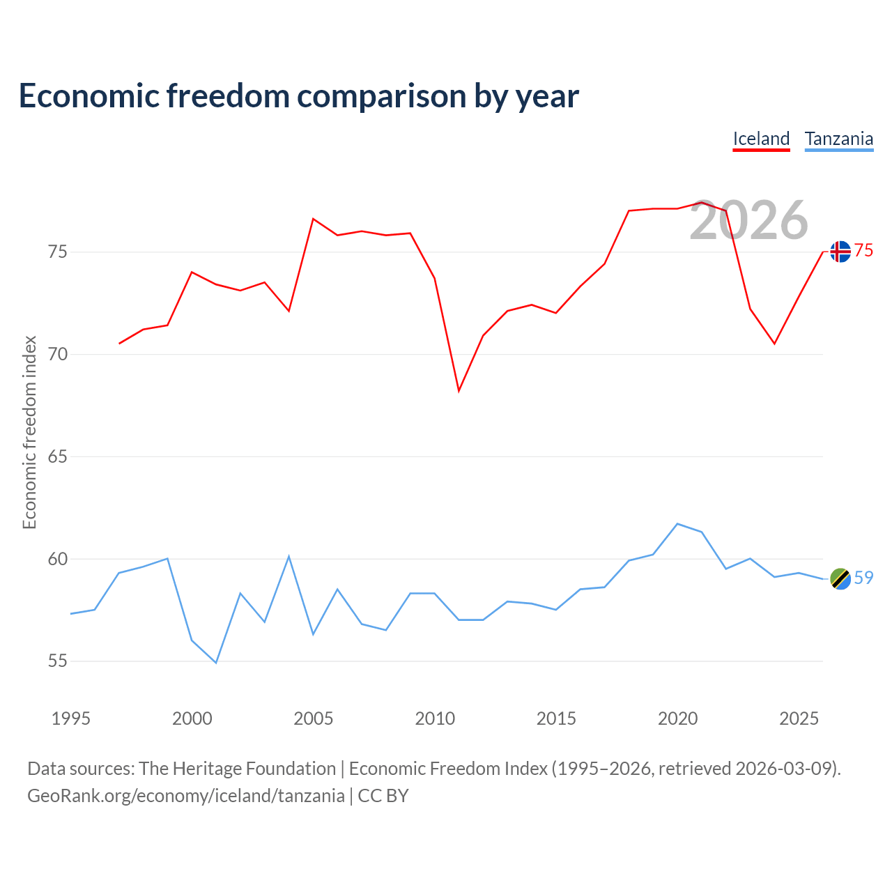 The Economic Freedom Index for Iceland is 75, ranking 19/197, compared to 59 for Tanzania, ranking 106/197. The chart above displays a comparison of annual changes in economic freedom indexes.