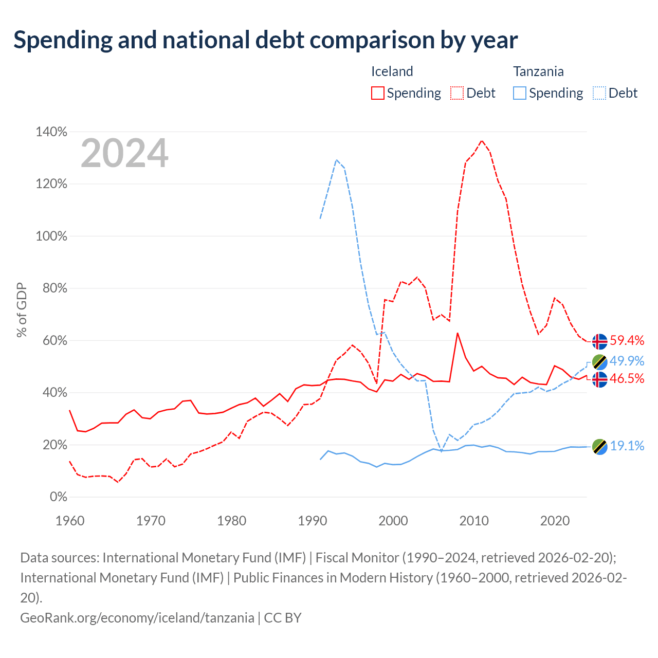 Iceland has $19.8B in government debt (59.4% of GDP), compared to $39.3B (49.9% of GDP) in Tanzania.