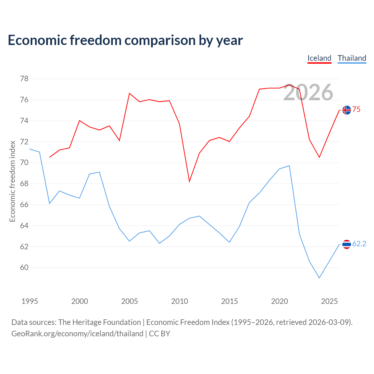 The Economic Freedom Index for Iceland is 75, ranking 19/197, compared to 62.2 for Thailand, ranking 88/197. The chart above displays a comparison of annual changes in economic freedom indexes.
