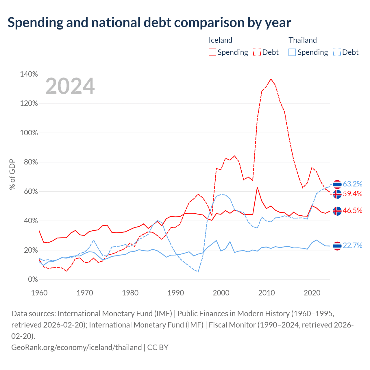 Iceland has $19.8B in government debt (59.4% of GDP), compared to $333B (63.2% of GDP) in Thailand.