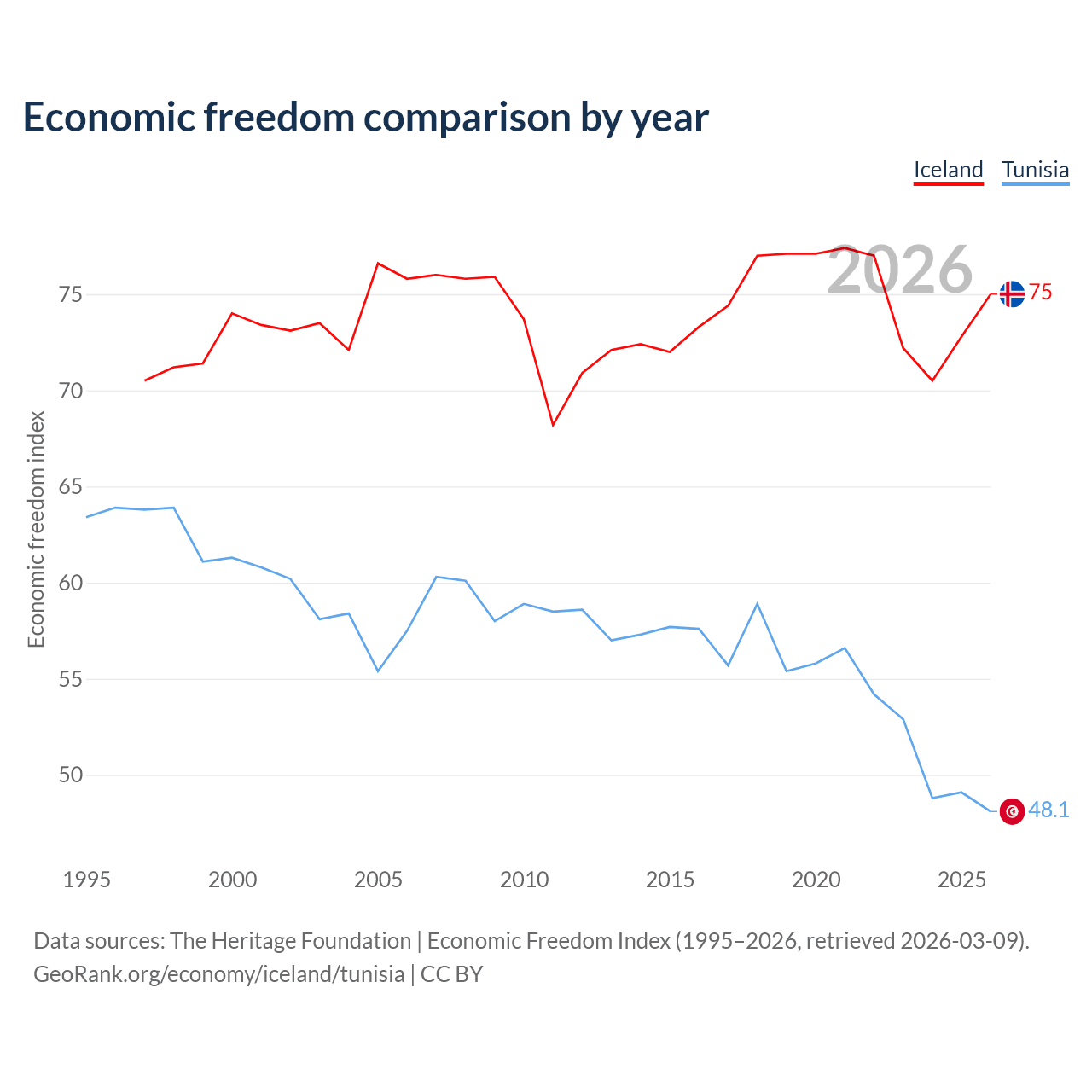 The Economic Freedom Index for Iceland is 75, ranking 19/197, compared to 48.1 for Tunisia, ranking 172/197. The chart above displays a comparison of annual changes in economic freedom indexes.