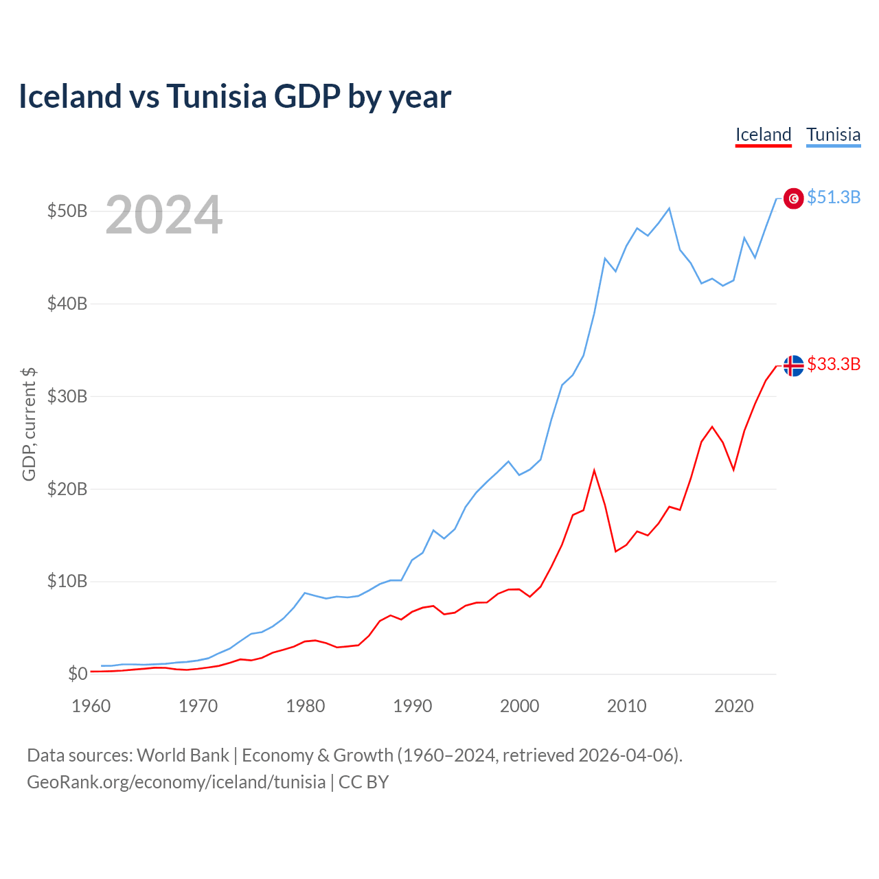 Iceland has a GDP of $33.3B compared to $51.3B for Tunisia, ranking 108/197 and 93/197 by economy size, respectively.