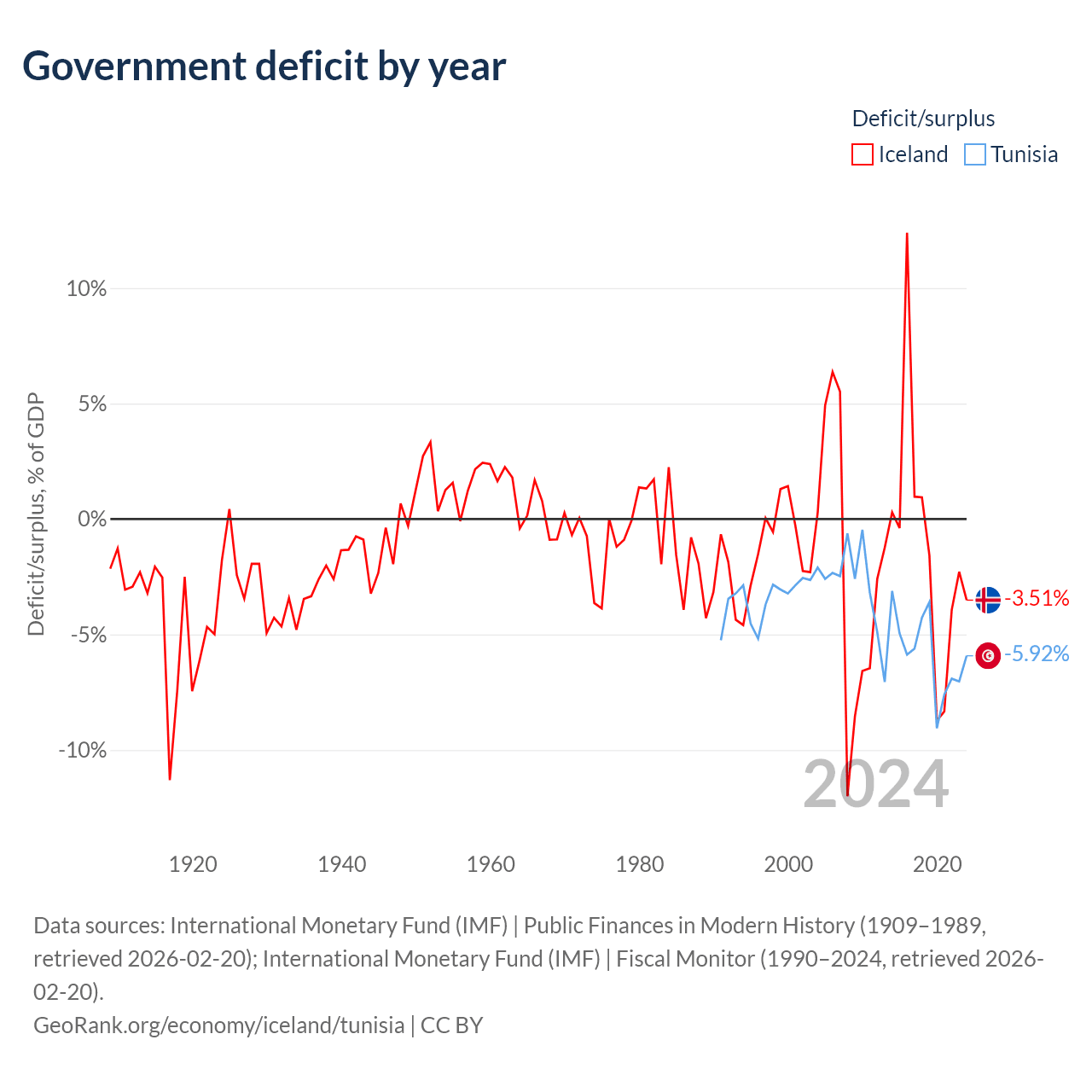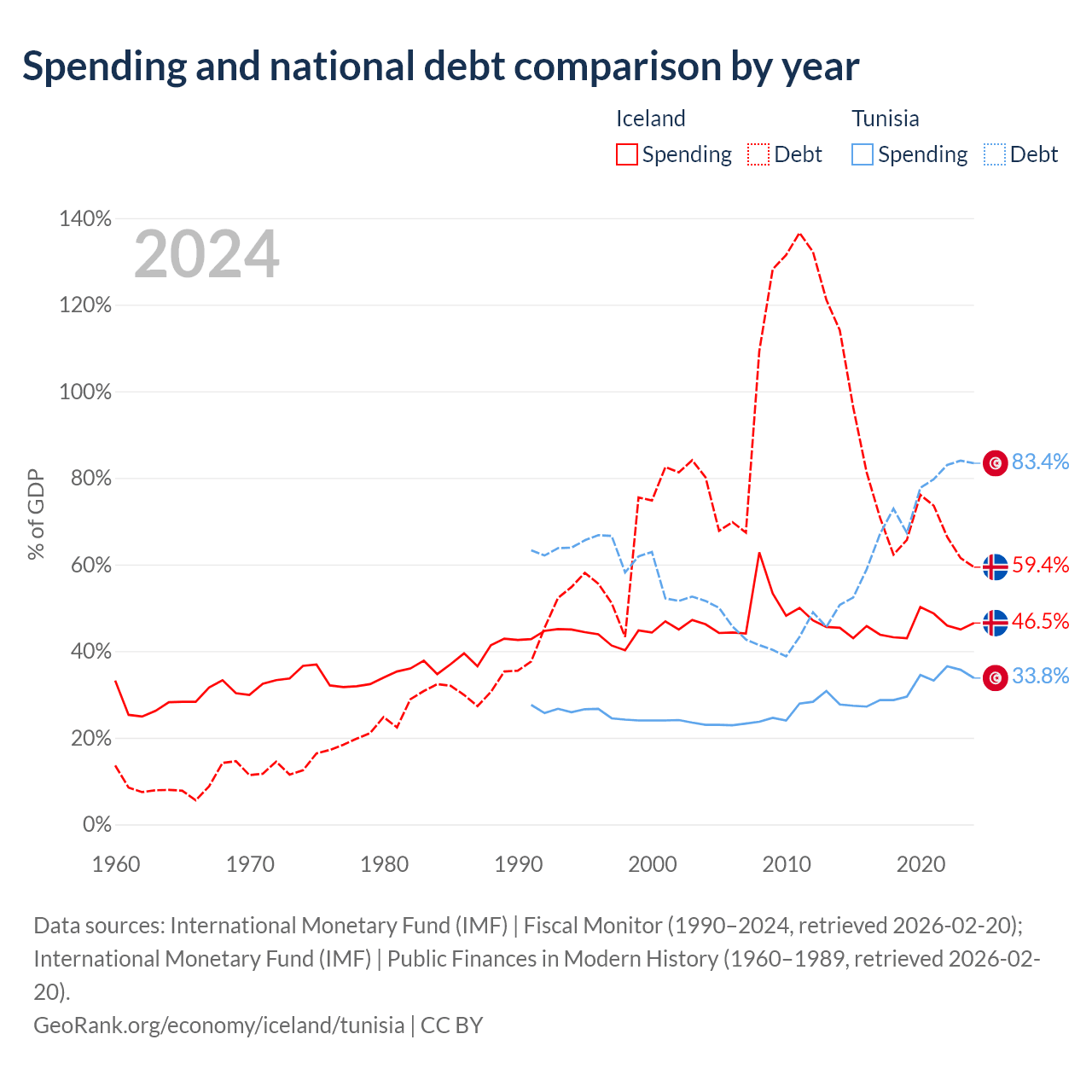 Iceland has $19.8B in government debt (59.4% of GDP), compared to $42.8B (83.4% of GDP) in Tunisia.