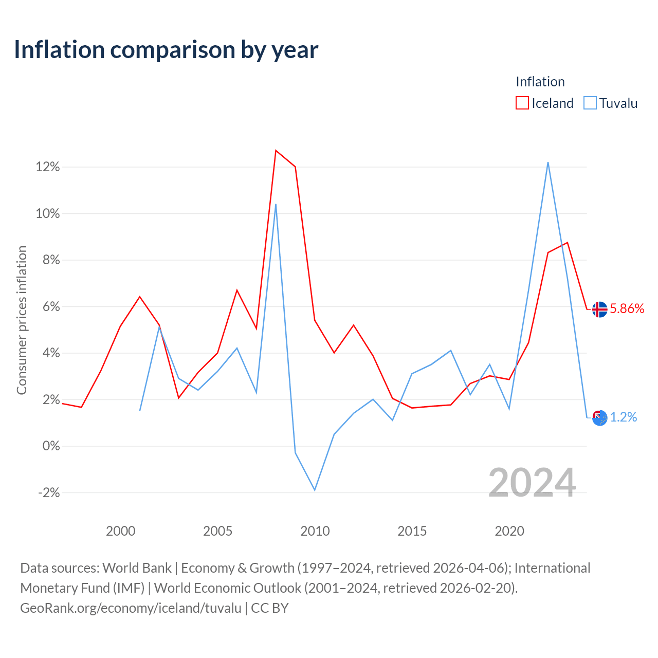 Over the past 24 years, Iceland has recorded an average annual inflation rate of 4.95%, compared with 3.34% in Tuvalu. In 2024, inflation was 5.86% in Iceland and 1.2% in Tuvalu.