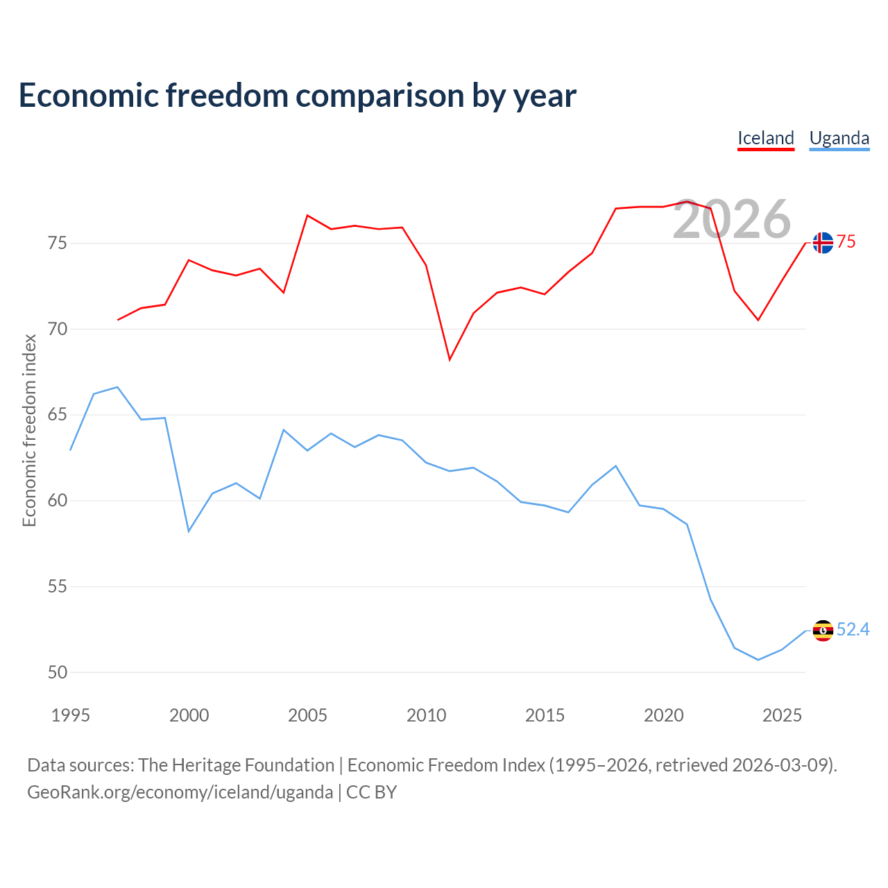 The Economic Freedom Index for Iceland is 75, ranking 19/197, compared to 52.4 for Uganda, ranking 149/197. The chart above displays a comparison of annual changes in economic freedom indexes.