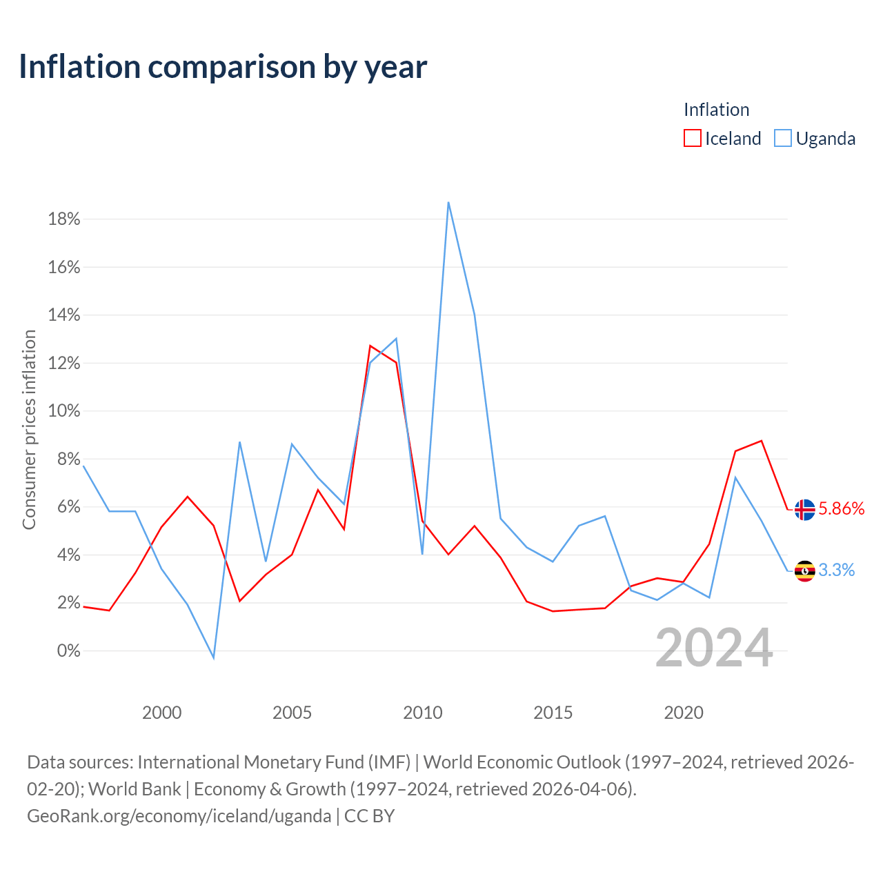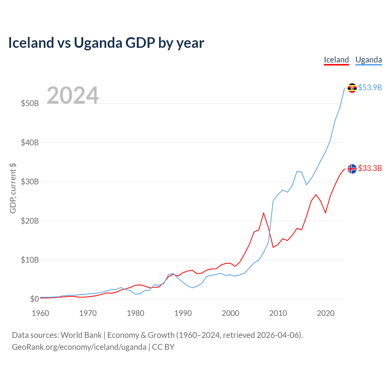 Iceland has a GDP of $33.3B compared to $53.9B for Uganda, ranking 108/197 and 89/197 by economy size, respectively.