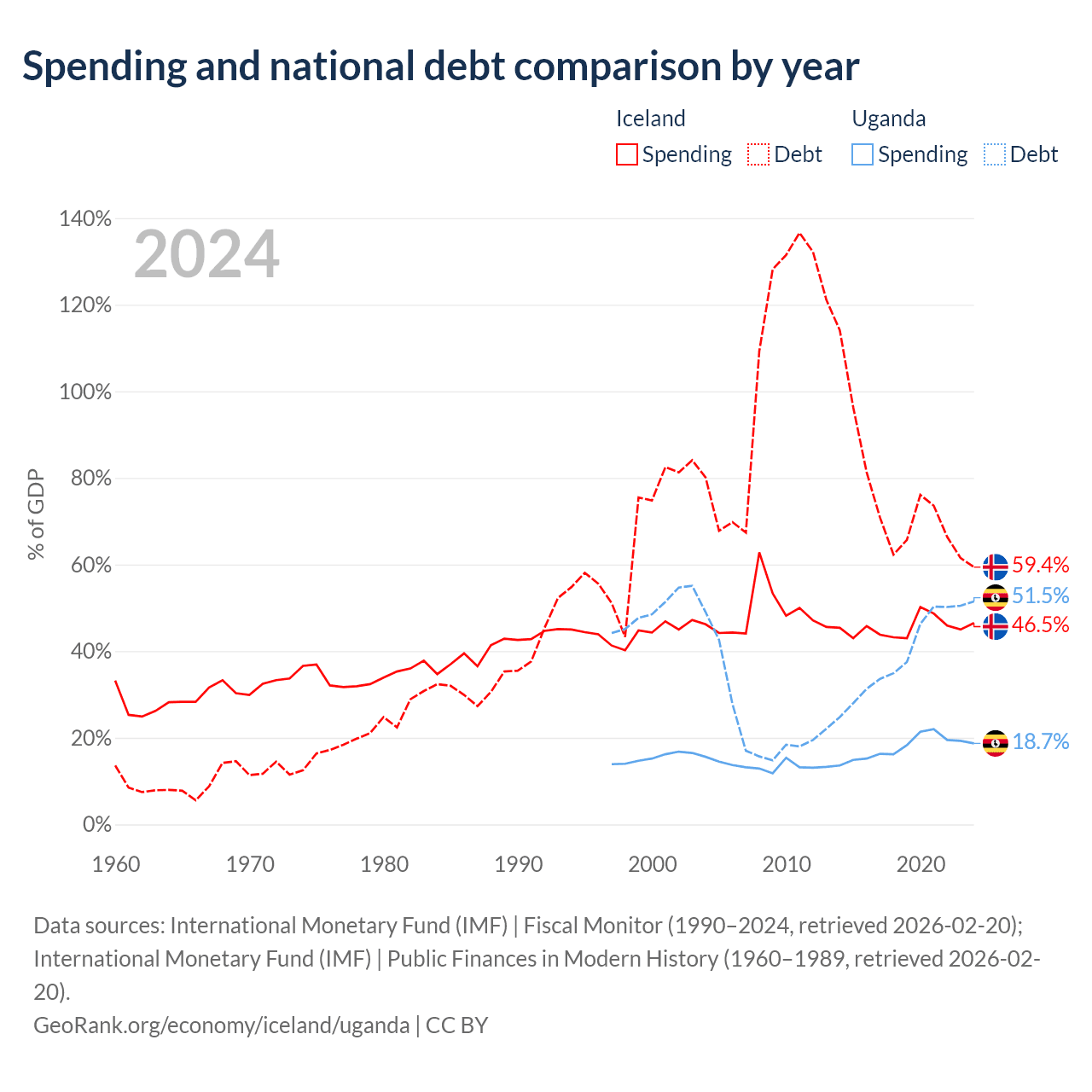 Iceland has $19.8B in government debt (59.4% of GDP), compared to $27.8B (51.5% of GDP) in Uganda.