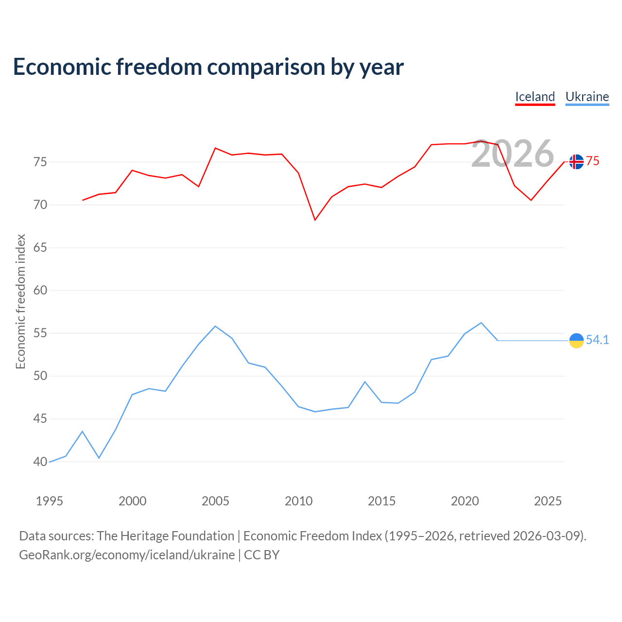 The Economic Freedom Index for Iceland is 75, ranking 19/197, compared to 54.1 for Ukraine, ranking 135/197. The chart above displays a comparison of annual changes in economic freedom indexes.