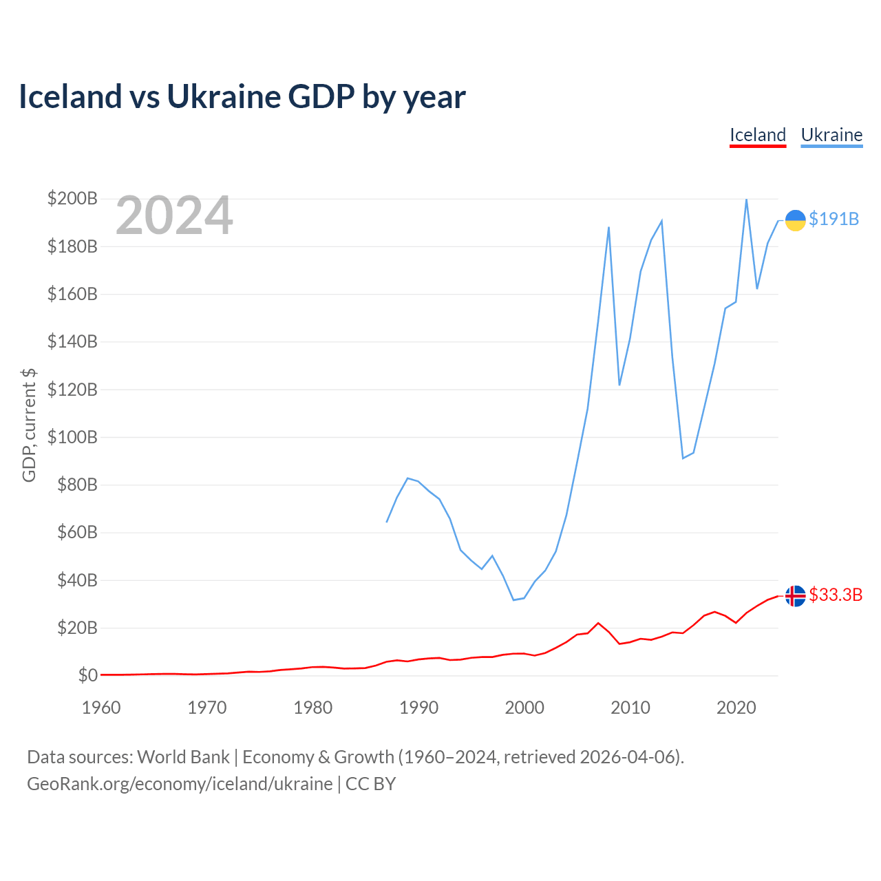Iceland has a GDP of $33.3B compared to $191B for Ukraine, ranking 108/197 and 57/197 by economy size, respectively.