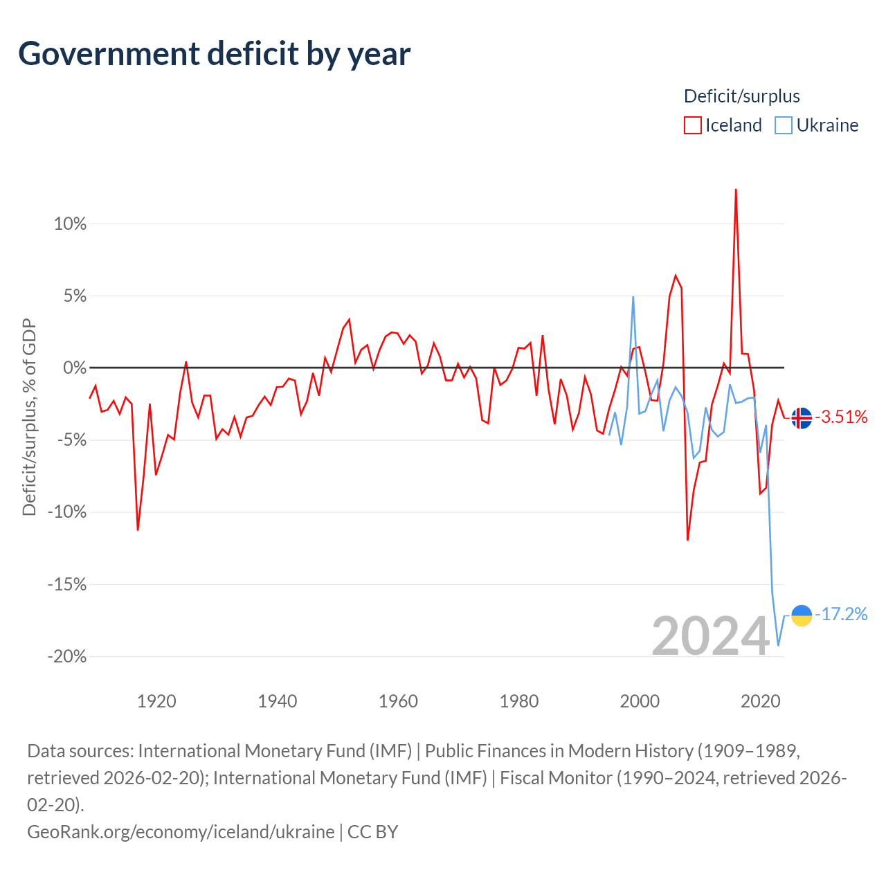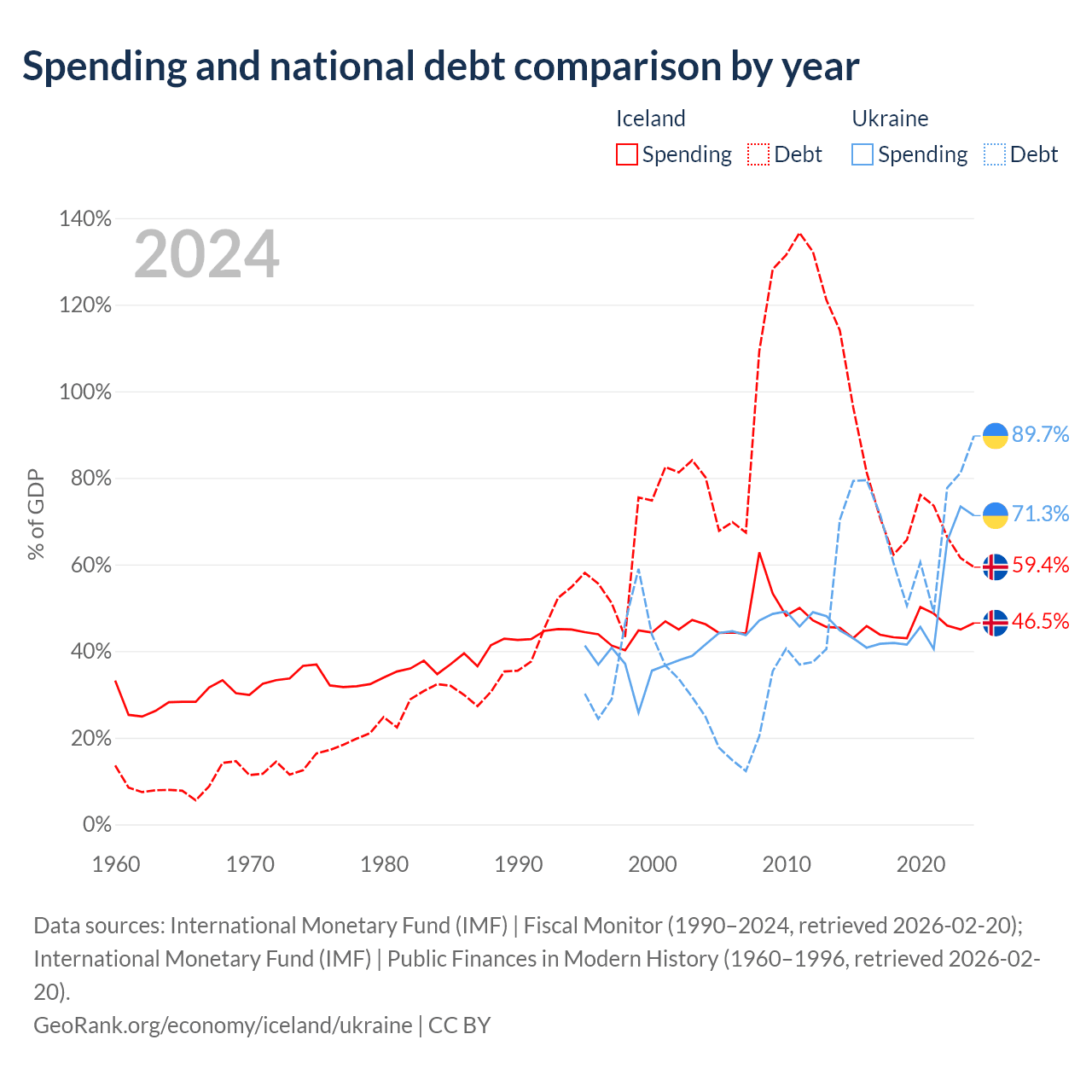 Iceland has $19.8B in government debt (59.4% of GDP), compared to $171B (89.7% of GDP) in Ukraine.