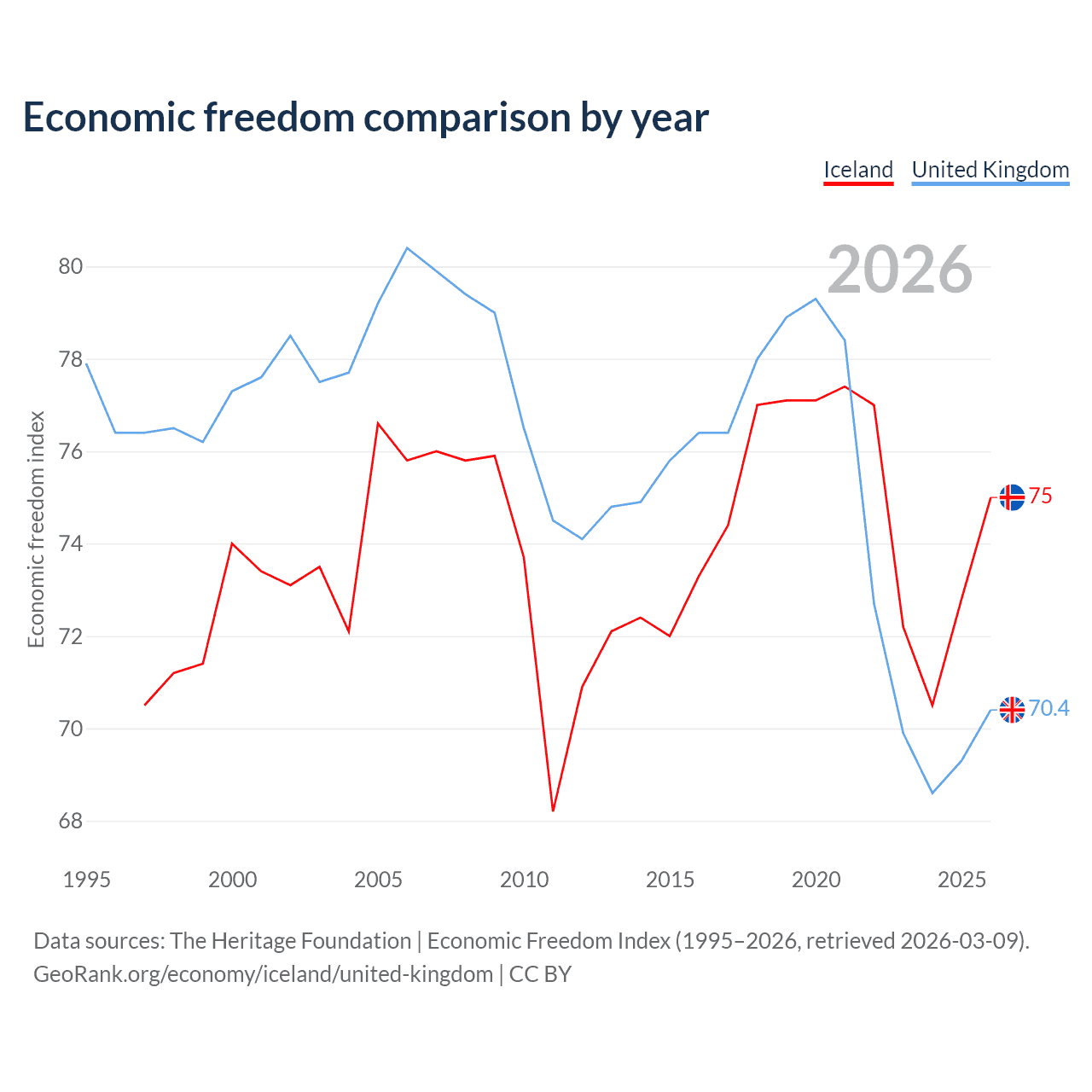 The Economic Freedom Index for Iceland is 75, ranking 19/197, compared to 70.4 for the United Kingdom, ranking 35/197. The chart above displays a comparison of annual changes in economic freedom indexes.