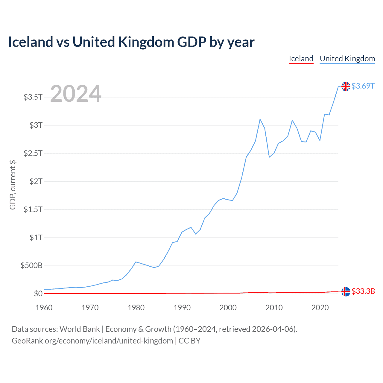 Iceland has a GDP of $33.3B compared to $3.69T for the United Kingdom, ranking 108/197 and 6/197 by economy size, respectively.