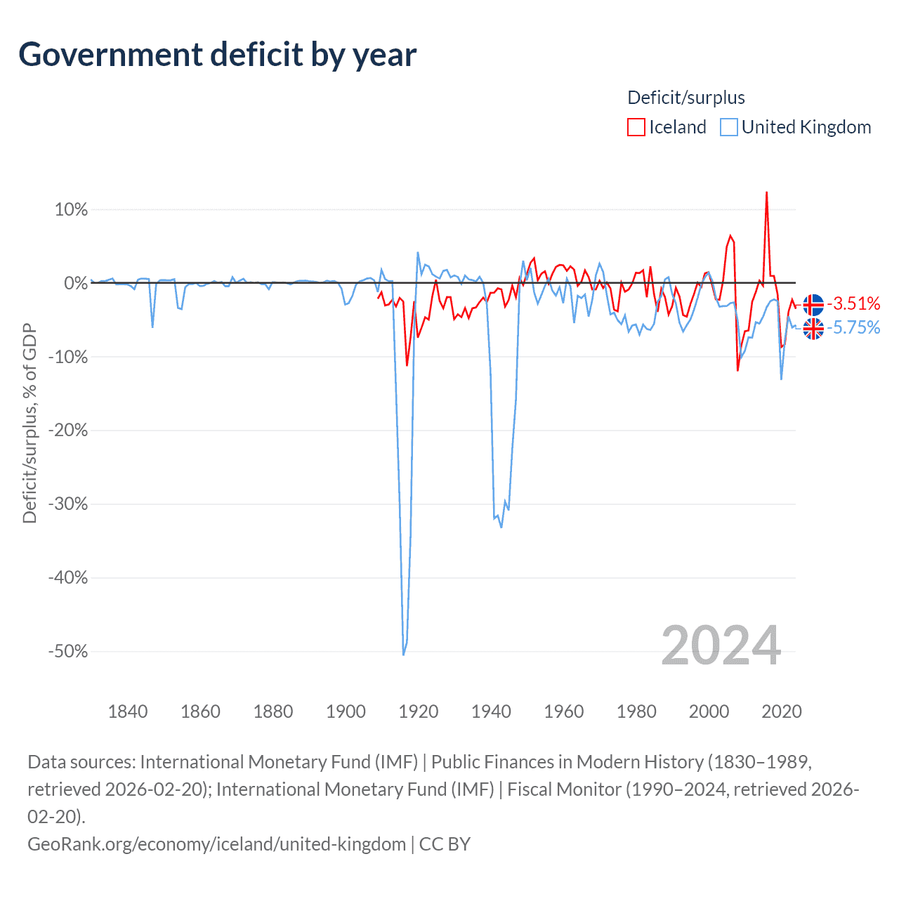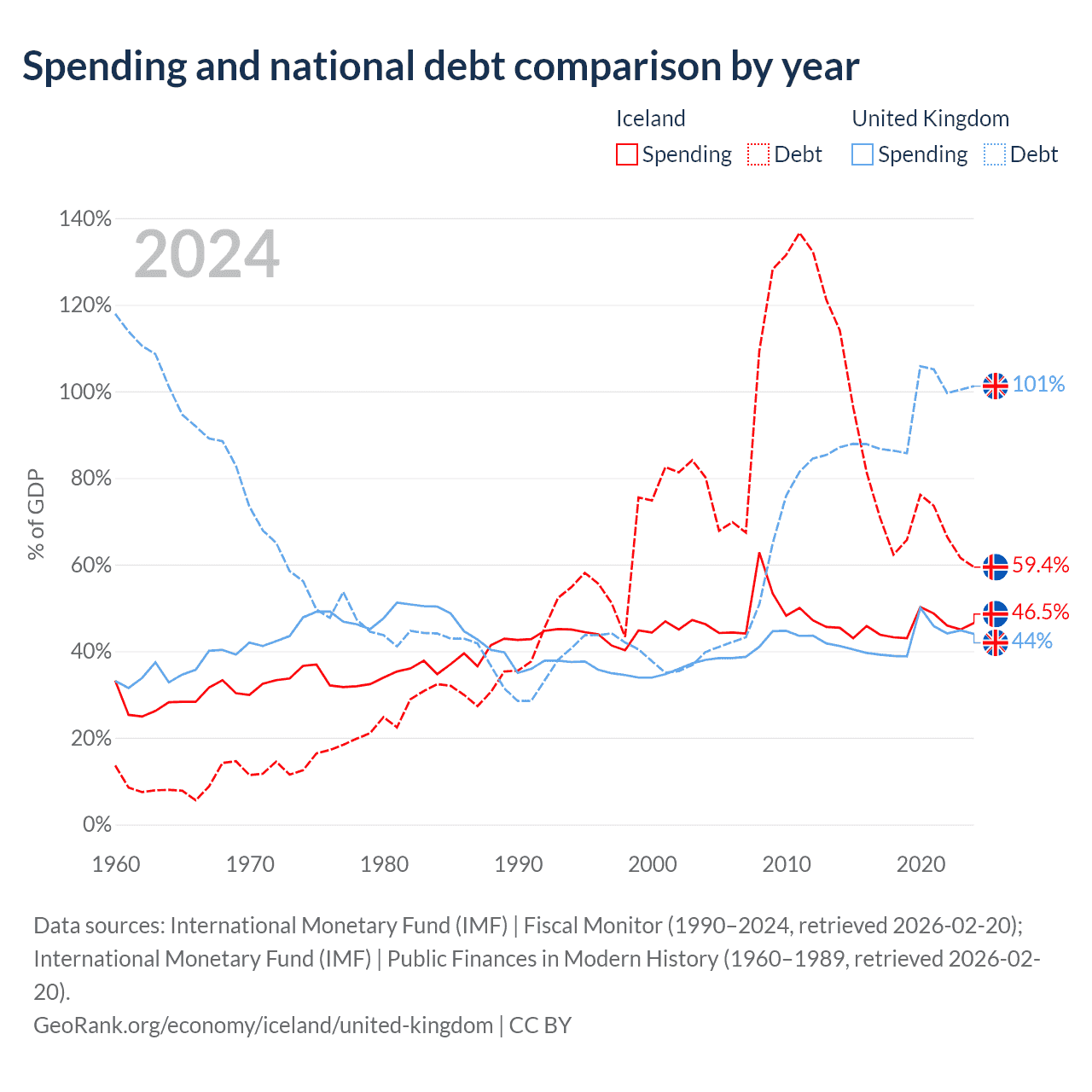 Iceland has $19.8B in government debt (59.4% of GDP), compared to $3.73T (101.2% of GDP) in the United Kingdom.