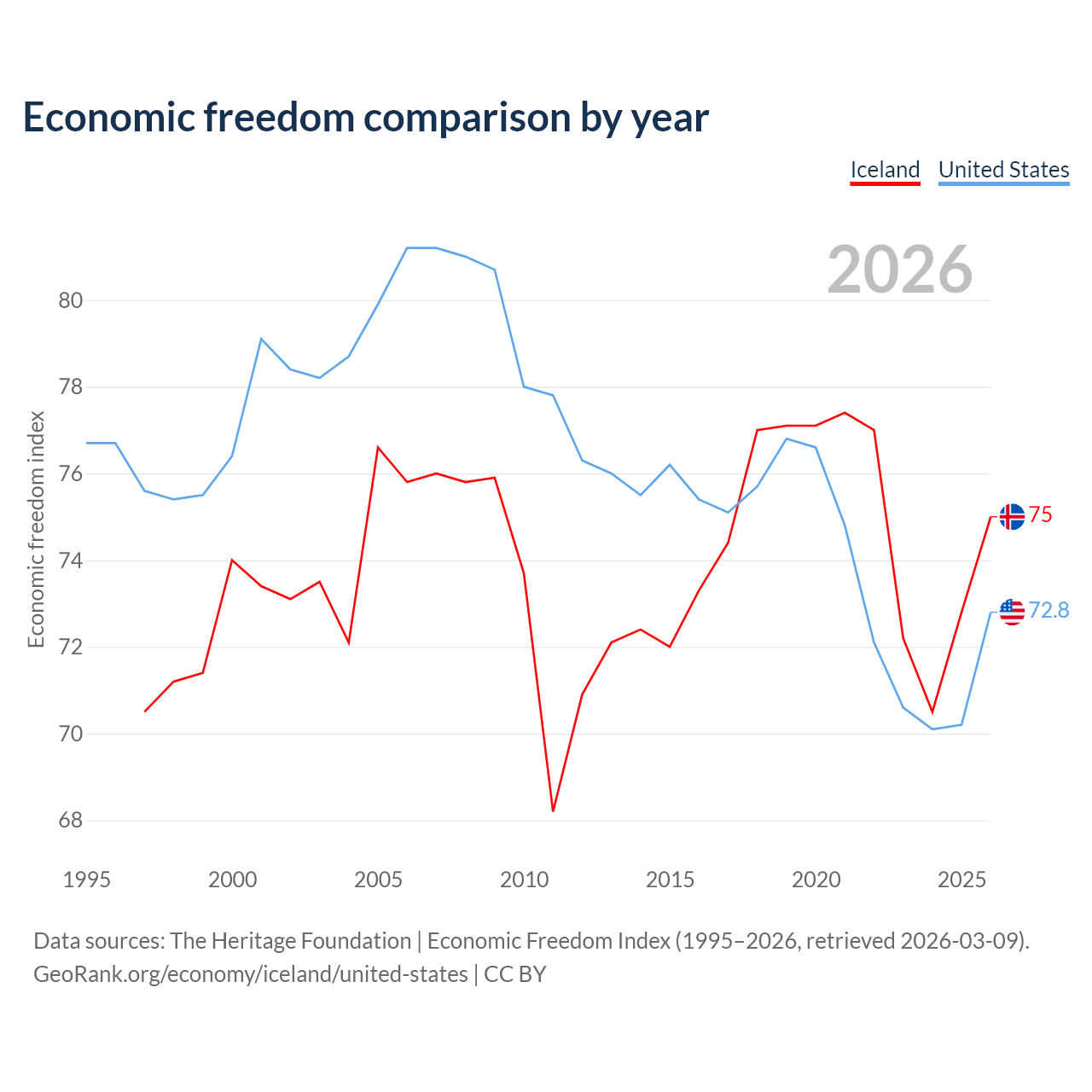 The Economic Freedom Index for Iceland is 75, ranking 19/197, compared to 72.8 for the United States, ranking 27/197. The chart above displays a comparison of annual changes in economic freedom indexes.