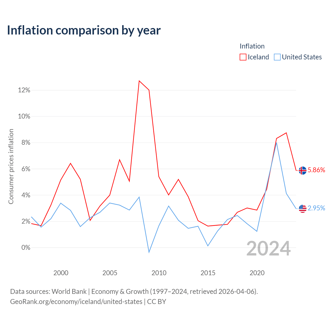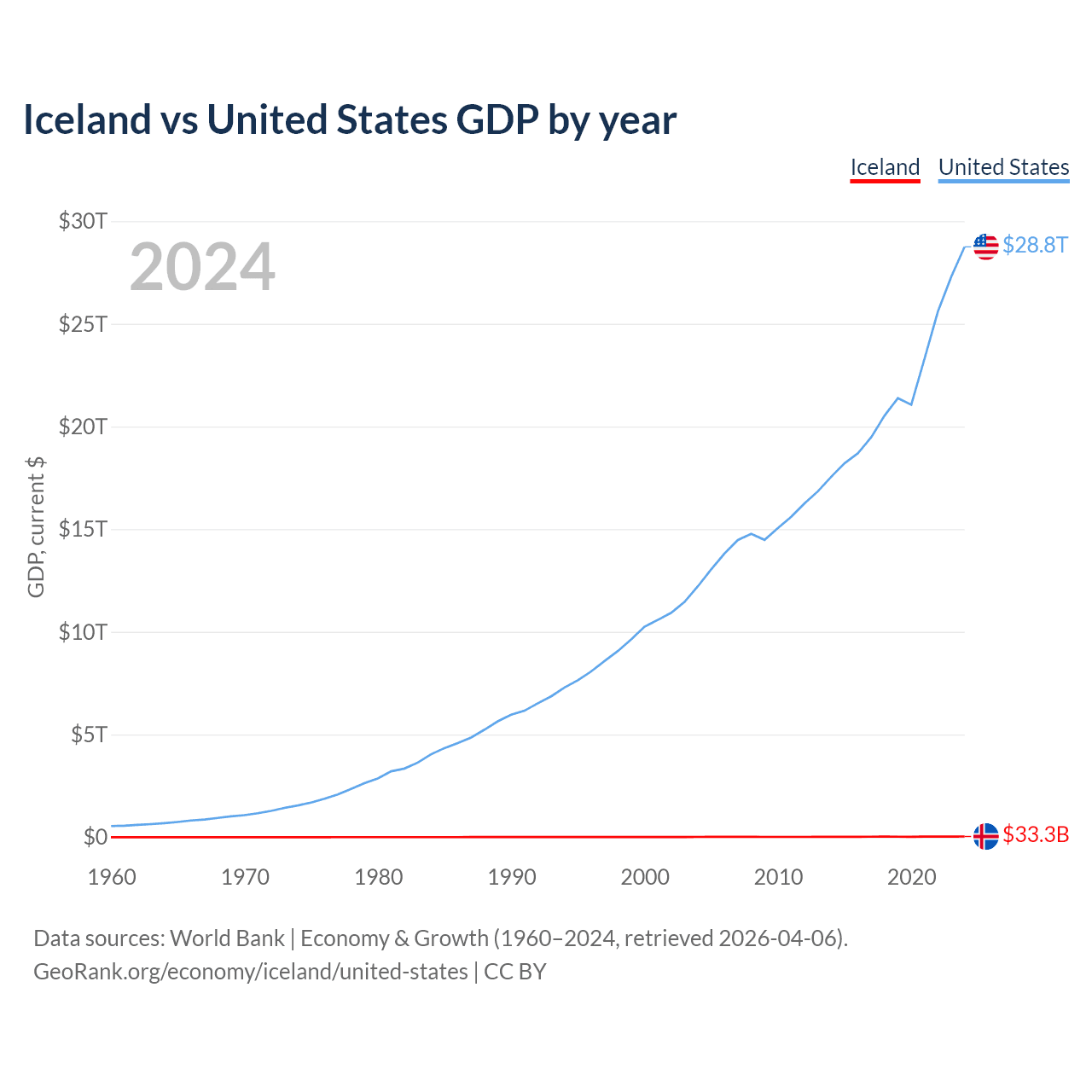 Iceland has a GDP of $33.3B compared to $28.8T for the United States, ranking 108/197 and 1/197 by economy size, respectively.