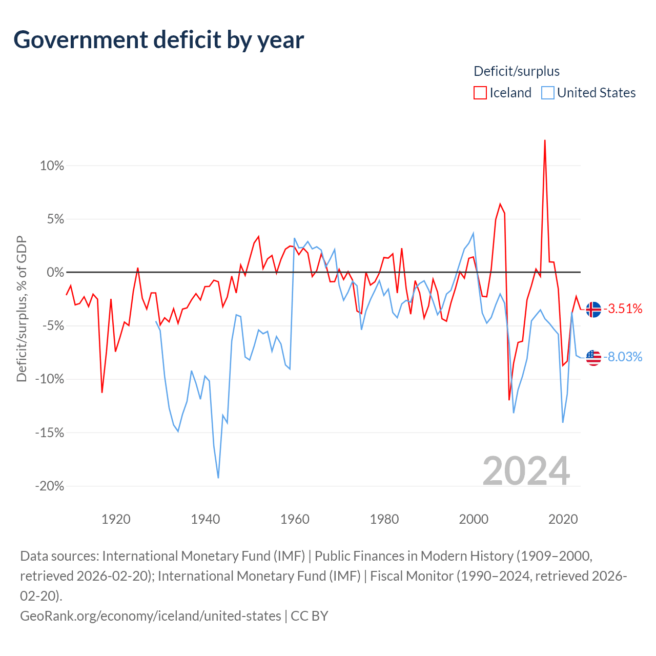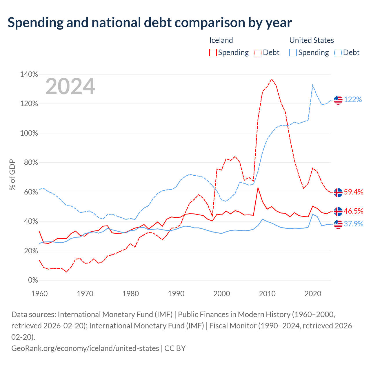 Iceland has $19.8B in government debt (59.4% of GDP), compared to $35.2T (122.3% of GDP) in the United States.