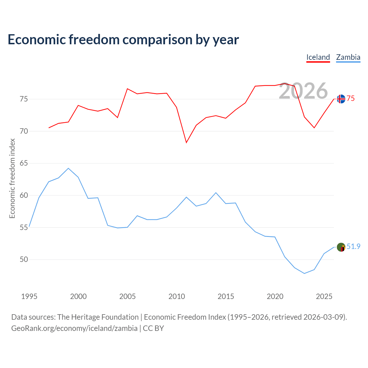 The Economic Freedom Index for Iceland is 75, ranking 19/197, compared to 51.9 for Zambia, ranking 152/197. The chart above displays a comparison of annual changes in economic freedom indexes.